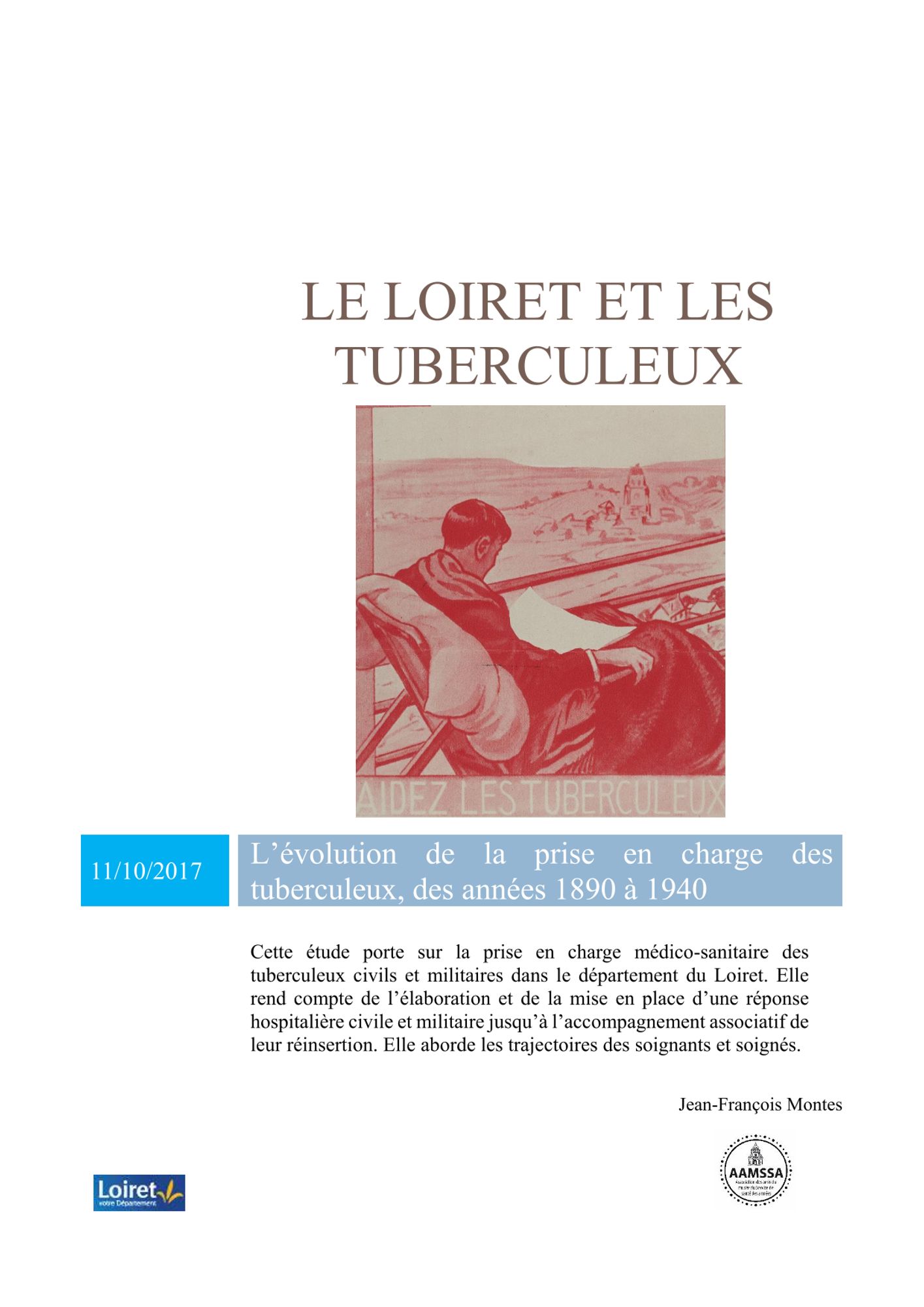 Dans le cadre des commémorations du centenaire de la Première Guerre Mondiale, le Département a souhaité jeter un éclairage particulier sur l’accueil hospitalier du militaire devenu tuberculeux dans le département du Loiret. Les prospections menées par Jean-François Montes ouvrent à cet égard de nouvelles perspectives sur la prise en charge sanitaire des « poilus ».