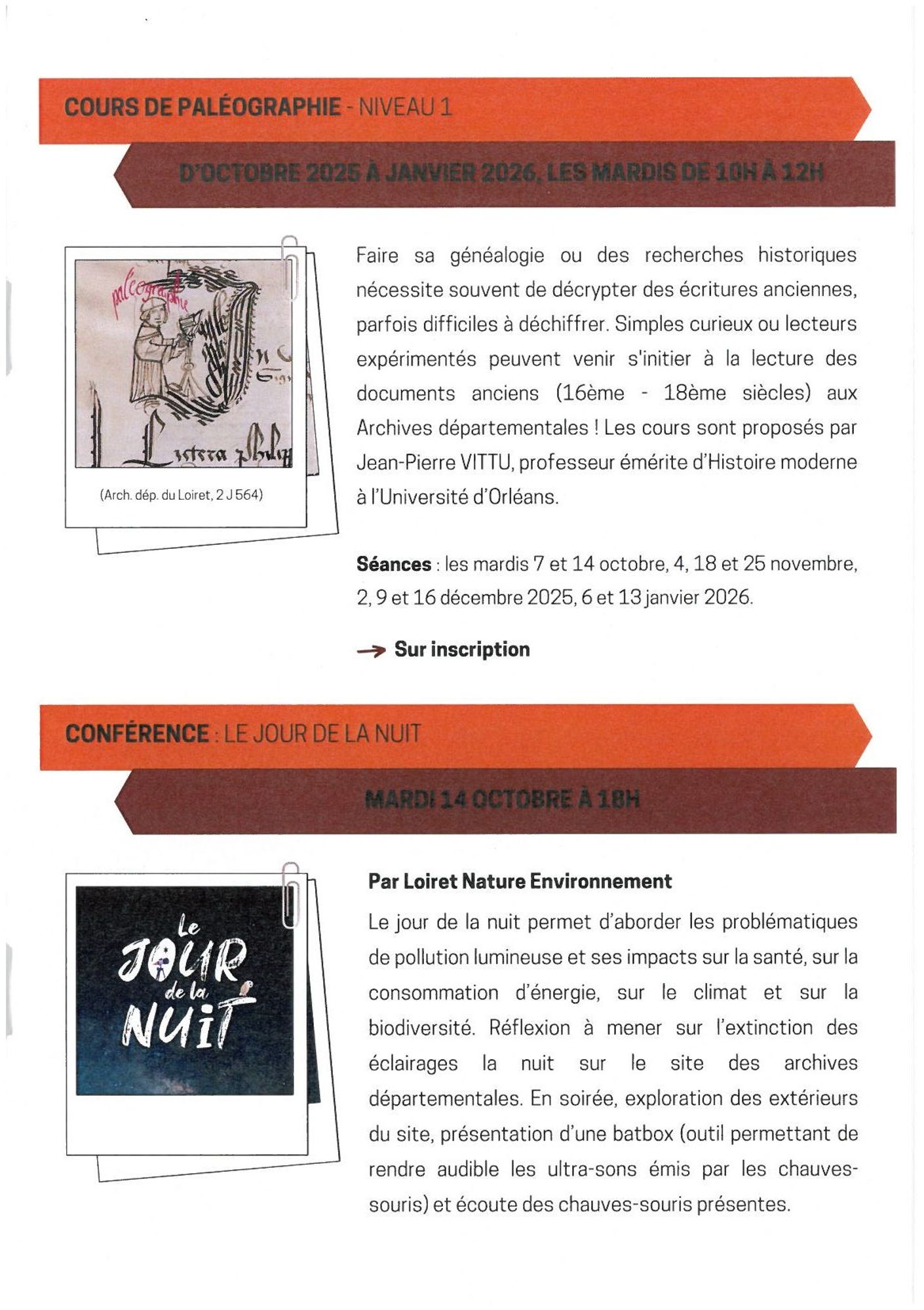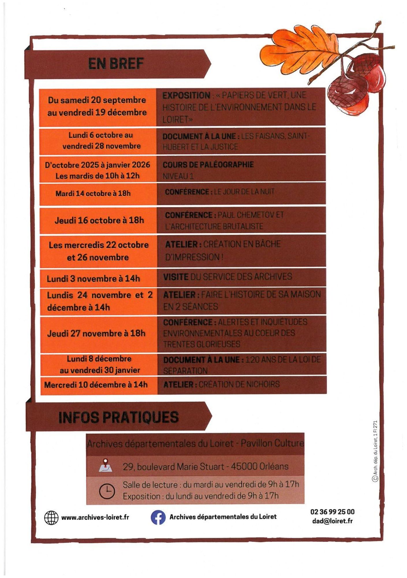 Vous souhaitez visiter une exposition, participer à un atelier, assister à une conférence ou venir visiter les Archives ? Retrouvez tout l'agenda des Archives départementales du Loiret du 4ème trimestre 2025 (octobre à décembre), pour ne manquer aucun rendez-vous !