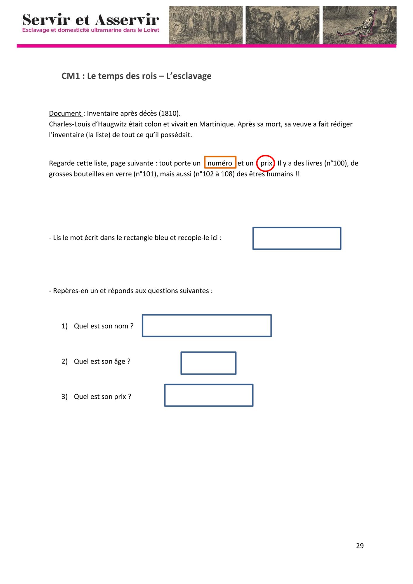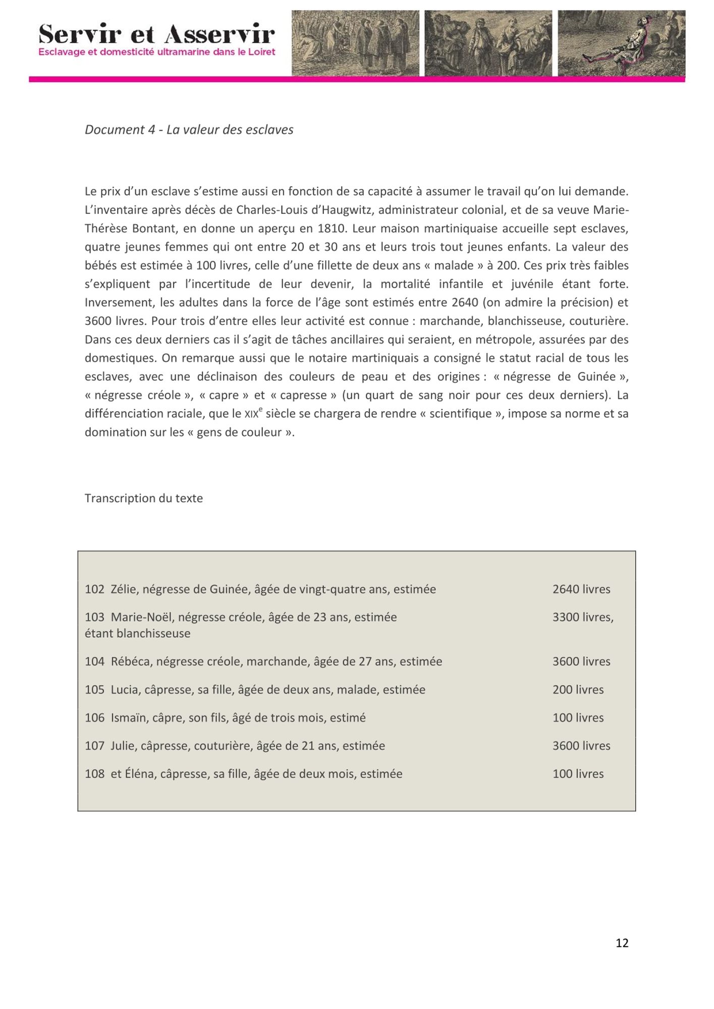 - Pour les adultes, un commentaires et une transcription (issus du livret pédagogique du dossier Servir&Asservir. Esclavage et domesticité ultramarine dans le Loiret)