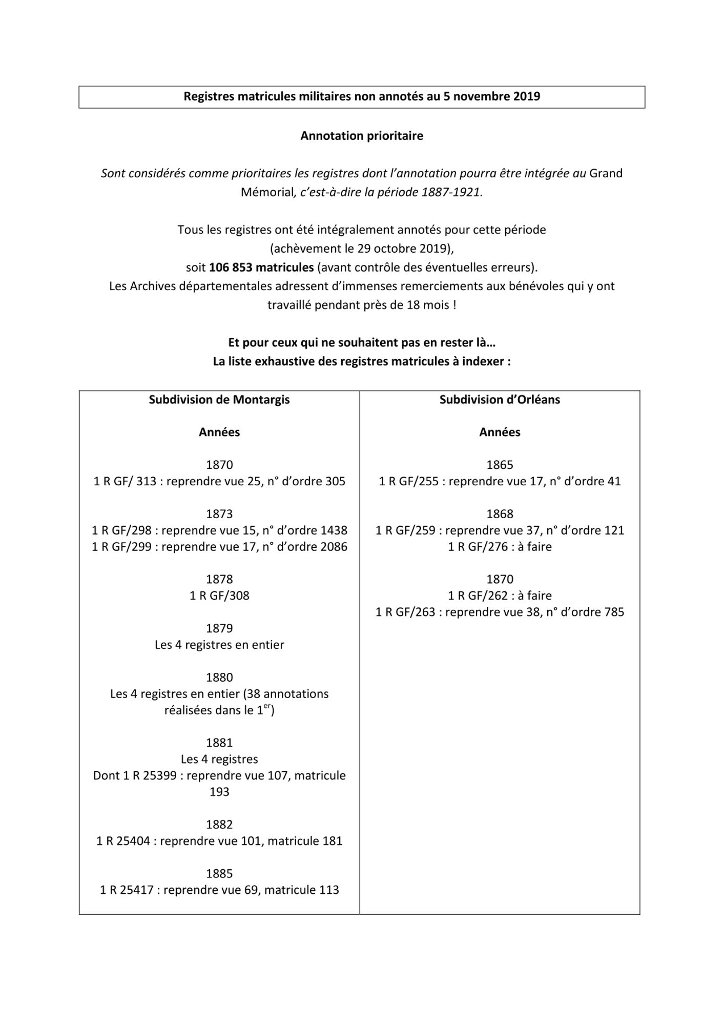 Pour ce faire, rien de plus simple : annotons ! Les registres de l’arrondissement d’Orléans sont presque achevés (138/142), il en reste un peu plus sur l’arrondissement de Montargis (81 achevés/110), mais l’objectif 100 % des registres matricules indexés pour le Grand Mémorial le 11 novembre 2019 est tout à fait réalisable !