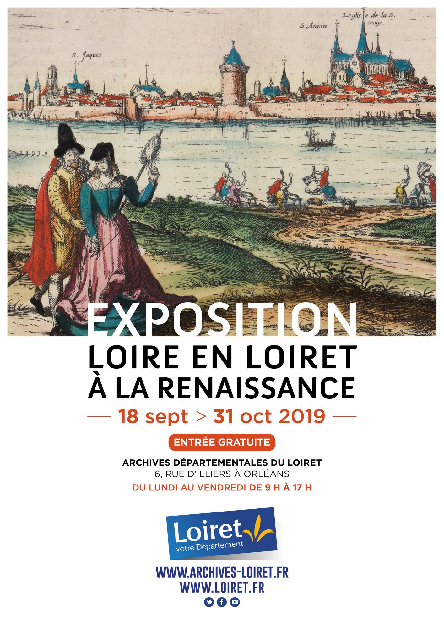 Dans le cadre des "500 ans de Renaissance(s) en Centre-Val de Loire", et en regard du Festival de Loire, les Archives départementales présentent l'exposition "Loire en Loiret à la Renaissance". Elle évoque l'histoire de la Loire loirétaine au XVIe siècle au travers d'écrits, cartes, plans et gravures de l'époque, en valorisant une quantaine de documents issus des collections des Archives. Quatre gravures ont également été empruntées à d'autres institutions de conservation (Musée de la Marine de Loire et Médiathèque d'Orléans.