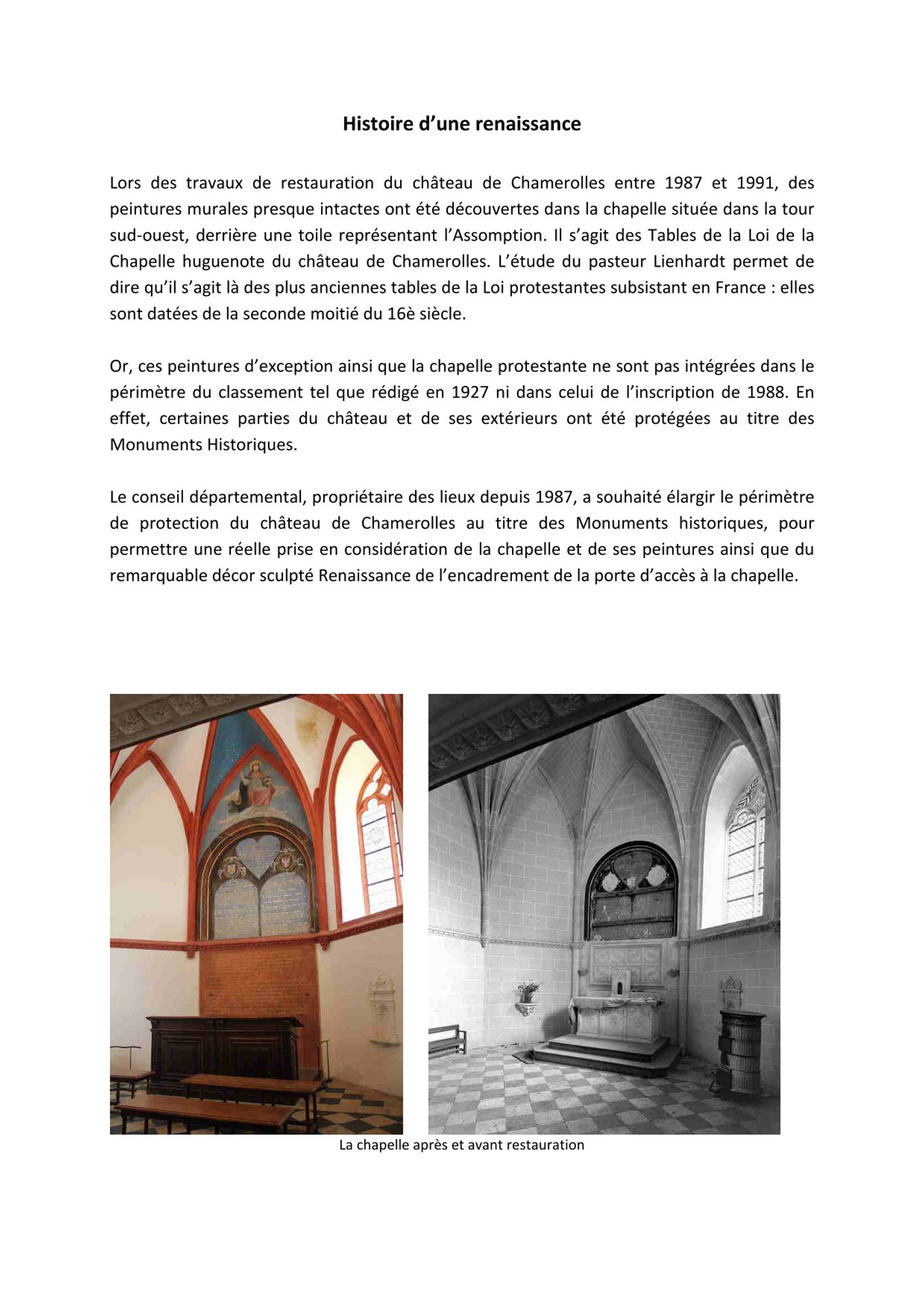 Le château de Chamerolles, demeure huguenote durant les guerres de religion, dont la chapelle abrite les plus anciennes tables de la Loi protestantes subsistant en France.