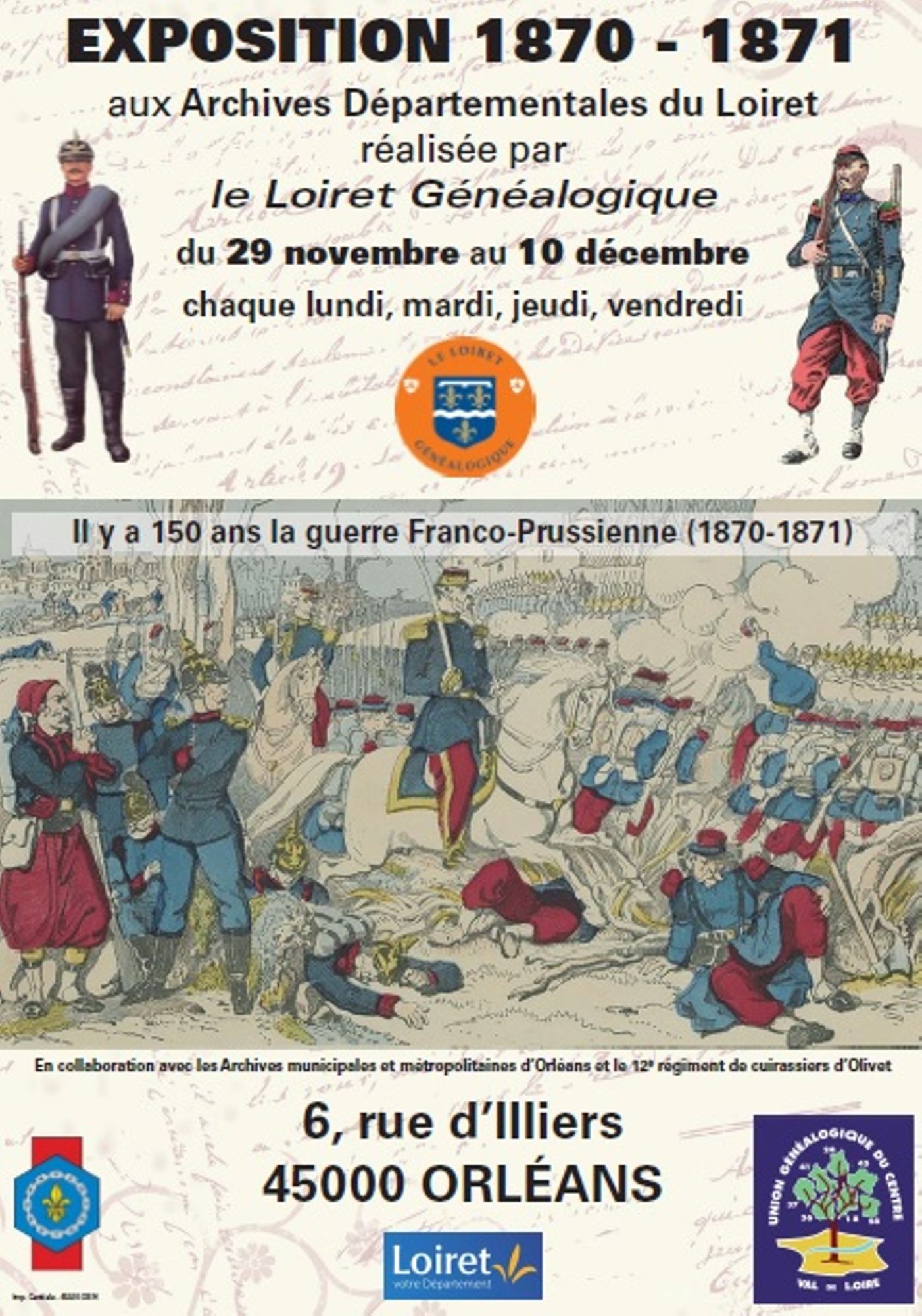 En écho à la conférence « 1870, entre mémoires régionales et oubli national » du lundi 6 décembre, le Loiret généalogique présente, en collaboration avec les Archives municipales d'Orléans et le 12ème régiment du cuirassier d'Olivet, son exposition « Il y a 150 ans, la guerre franco-prussienne de 1870-1871 » au sein des Archives départementales du Loiret.