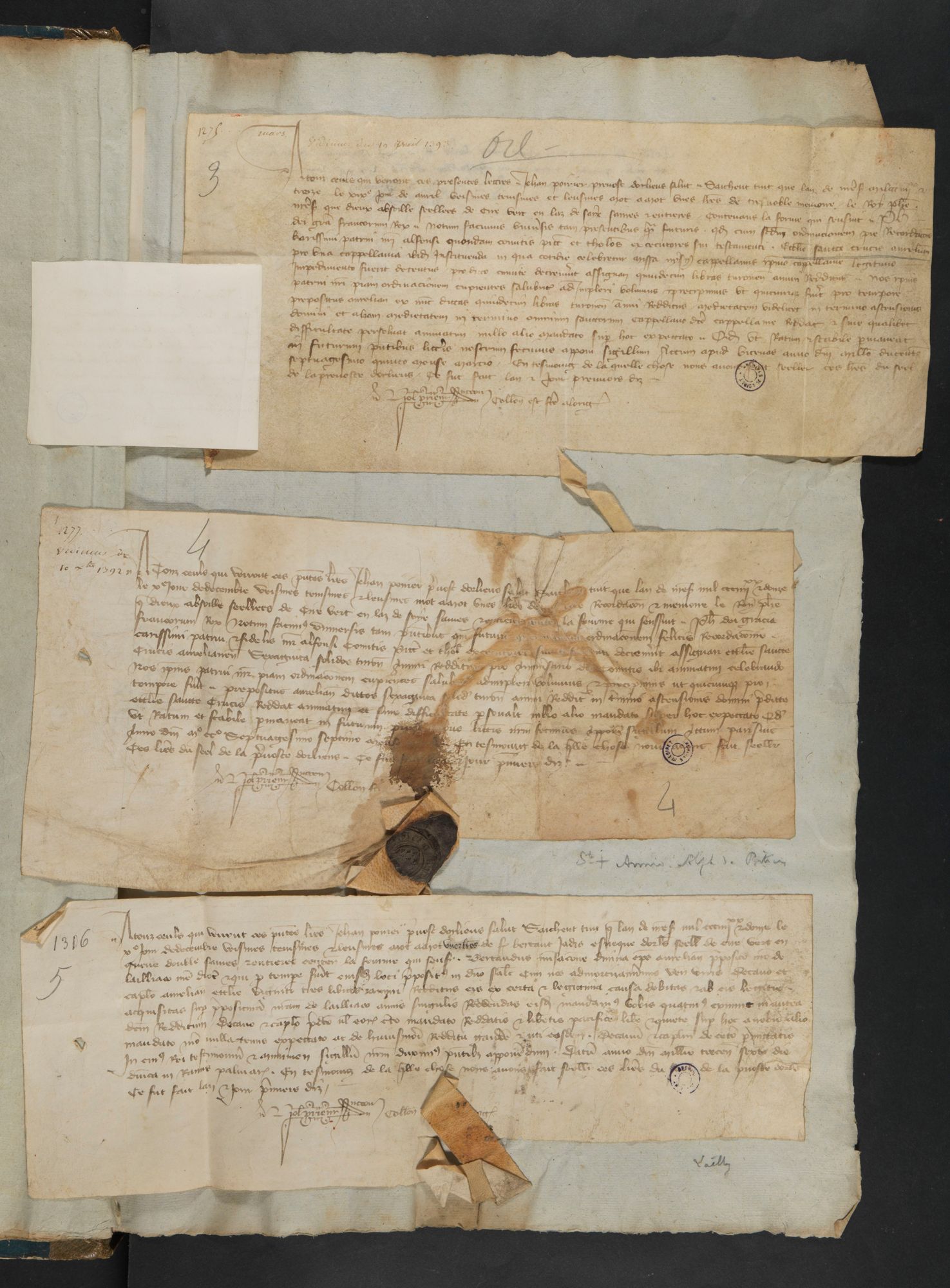« La complexité provient essentiellement de l’état de conservation des documents. Si le parchemin est un support particulièrement résistant, les pliures qu’il subit entraîne une déformation qu’il est nécessaire de compenser lors de la prise de vue » explique Franck, responsable du laboratoire de photographie. La problématique est encore plus aigüe avec la collection Joursanvault. En effet, les documents de celle-ci ont été collés dans de grands registres sur des feuilles de papier. « Il faut être vigilant à ne pas endommager le support et déplier les parchemins qui prennent alors une plus grande place. Tout est fait pour rendre accessible l’information sans que le lecteur ne se rende compte des opérations que nous avons dû réaliser pour y parvenir » renchérit-il.
