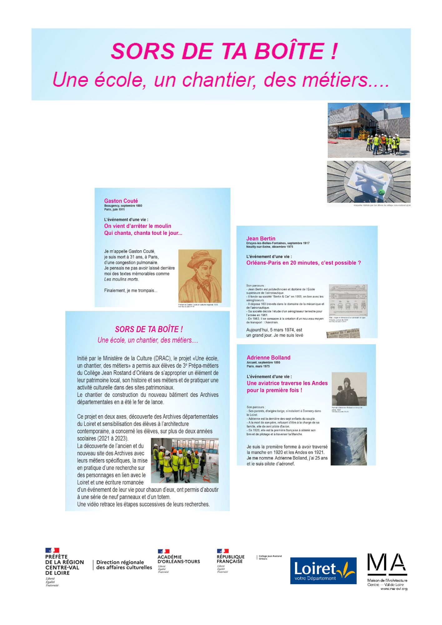 Une exposition réalisée dans le cadre du dispositif « Une école, un chantier, des métiers » par les élèves de 3e Pro du collège Jean-Rostand, en partenariat avec la Maison de l’Architecture et du Centre. A partir de leur découverte des archives, certes cachées dans leur boîte mais témoignant de tant de vies connues ou inconnues, ils vous présentent neuf personnages, saisis à un instant T de leur vie. En se projetant ensuite dans le futur du site, ils ont imaginé des maquettes architecturales d’une possible extension, qu’ils ont construites à l’échelle et mises en valeur par leurs prises de vue.