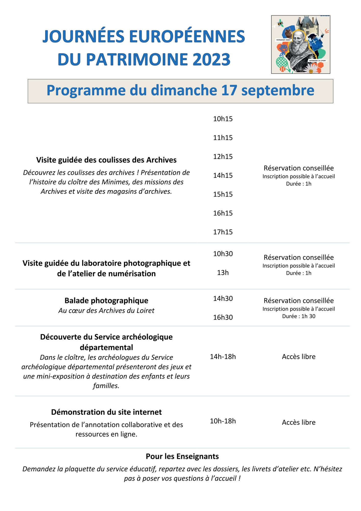 Pour les visites guidées, la réservation est conseillée au 02 36 99 25 00 ou par mail : dad@loiret.fr