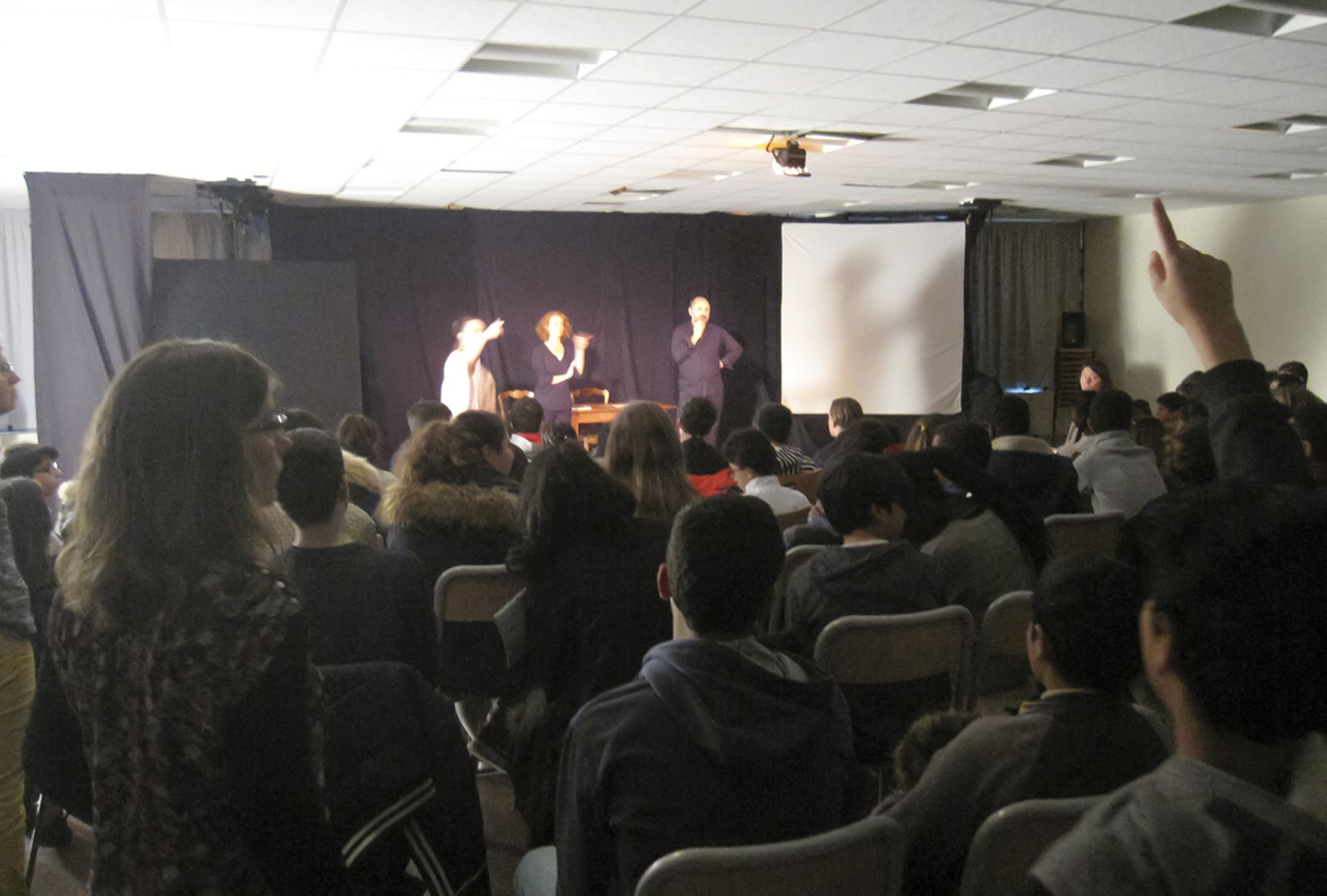 Pour cette séance au collège Etienne Dolet, l’auteure et metteure-en-scène est intervenue la veille, en compagnie d’une archiviste. Le but était de sensibiliser les élèves aux archives, leur expliquer ce que c’est et leur faire comprendre pourquoi le besoin s’est fait sentir de les mettre en valeur par le théâtre. A cet effet, des fac-similés de documents leur ont été montrés, qu’ils ont pris intérêt à déchiffrer. Pour l’auteure, le but était d’expliquer sa démarche : à partir des documents bruts elle s’est imprégnée des affaires judiciaires, a cerné au plus près les personnages et écrit des dialogues leur donnant vie, puis elle a monté un scenario, permettant à la fois de montrer le métier d’archiviste mais aussi de faire le lien entre toutes ces histoires très diverses. De 10h à 15h, les professionnels ont ainsi touché les quatre classes de quatrième, en demi-groupes ou par classes entières : les élèves se sont bien pris au jeu et avaient hâte d’assister à la représentation de la pièce le lendemain.