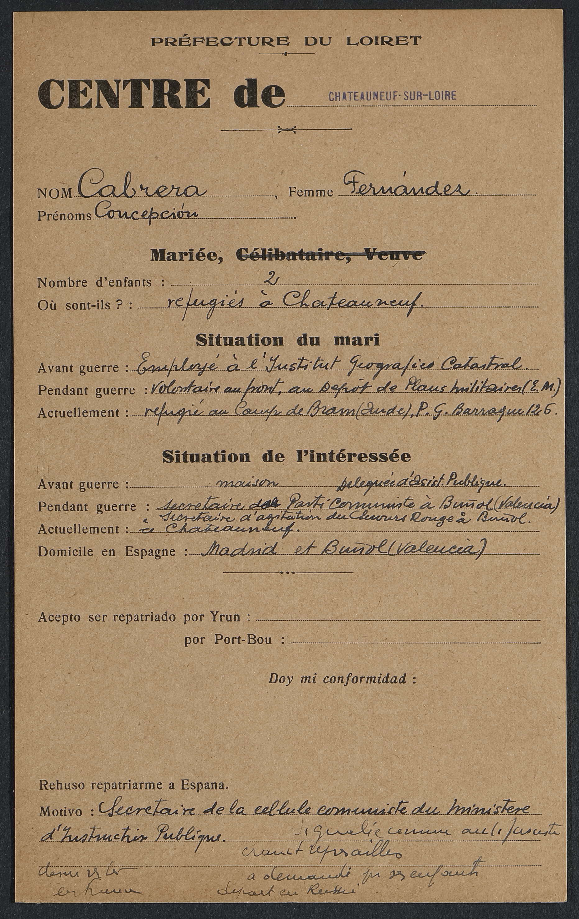 Le document, non daté précisément, est postérieur à octobre 1937, lorsque les autorités cherchent à organiser le retour des réfugiés espagnols dans leur pays. La femme concernée par cette fiche administrative, Concepción Cabrera Fernandez, vit alors avec ses deux enfants à Châteauneuf-sur-Loire. Elle est politiquement très engagée : en Espagne elle était secrétaire de cellule communiste du ministère de l’Instruction publique à Buñol, à une quarantaine de kilomètres de Valence, mais aussi « secrétaire d’agitation » du Secours rouge, organisme d’assistance lié à l’Internationale communiste. Son mari, employé du cadastre dans son pays d’origine, était volontaire dans l’armée républicaine. Il reste pour l’heure interné au camp de Bram dans l’Aude. Fortement liée à l’extrême gauche, cette famille aurait vraisemblablement à subir des représailles si elle venait à retourner en Espagne. C’est pourquoi Concepción Cabrera Fernandez refuse cette solution et en évoque une plus en phase avec ses convictions : le départ pour l’URSS.