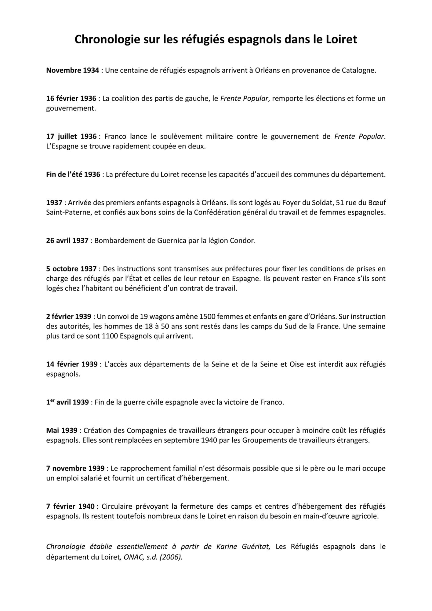 L’Office national des anciens Combattants du Loiret (ONAC) a publié en 2007 un petit ouvrage, Les réfugiés espagnols dans le département du Loiret. 1939-1945 (Arch. dép. du Loiret, BH Br 13314) qui présente de façon à la fois précise et concise la situation des réfugiés espagnols dans le département en se basant sur la consultation des archives et sur des témoignages oraux .