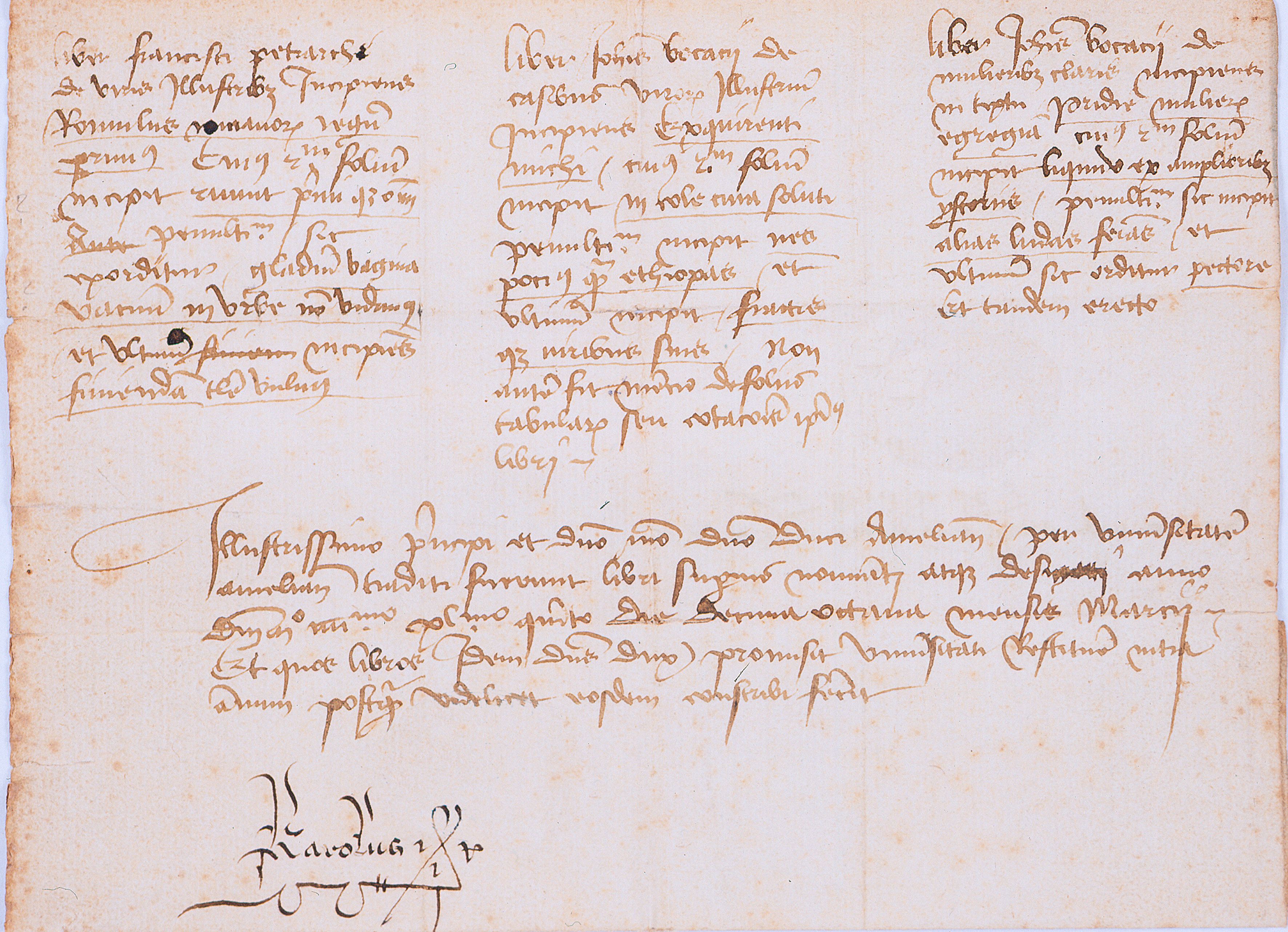 Le reçu de prêt est entièrement rédigé en latin, Charles lui-même signant « Karolus ». Les trois ouvrages sont présentés en colonne, chacun étant décrit par les incipit de ses deux premières et de ses deux dernières pages (premier folio et dernier folio, recto et verso). Ils appartiennent tous au même genre, celui des vies illustres. L’un est de Pétrarque, les deux autres de Boccace, auteurs qui, avec Dante, annoncent l’humanisme. On peut voir là, déjà, une fascination pour le Nord de l’Italie qui apparaît en ce milieu de xve siècle comme le lieu de l’avant-garde artistique d’où émerge la Renaissance. Le duc d’Orléans s’engage à rapporter les trois manuscrits dans l’année.