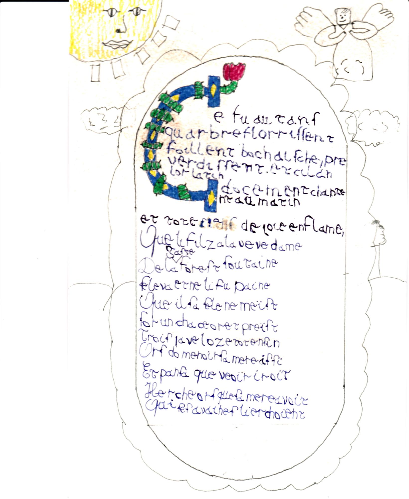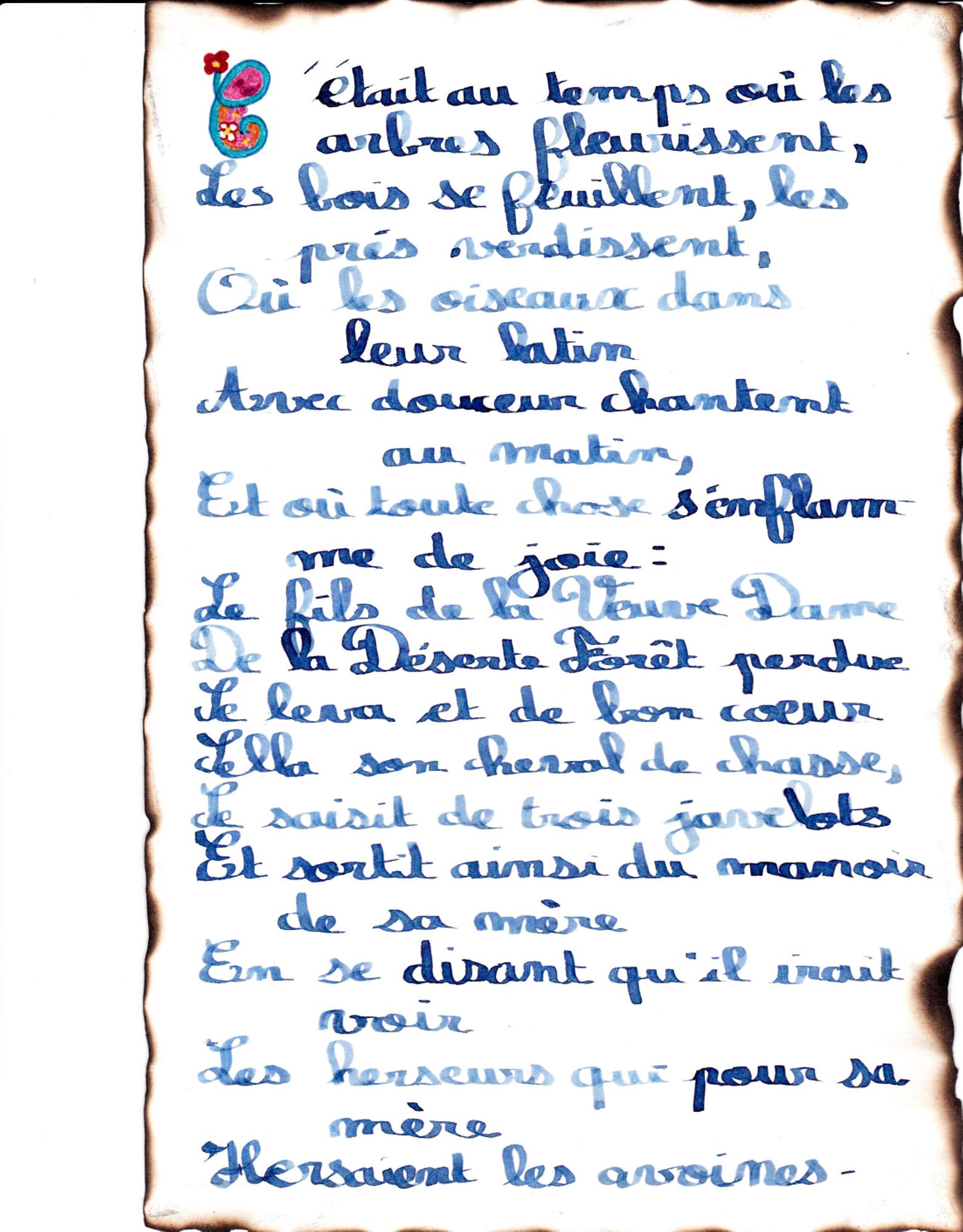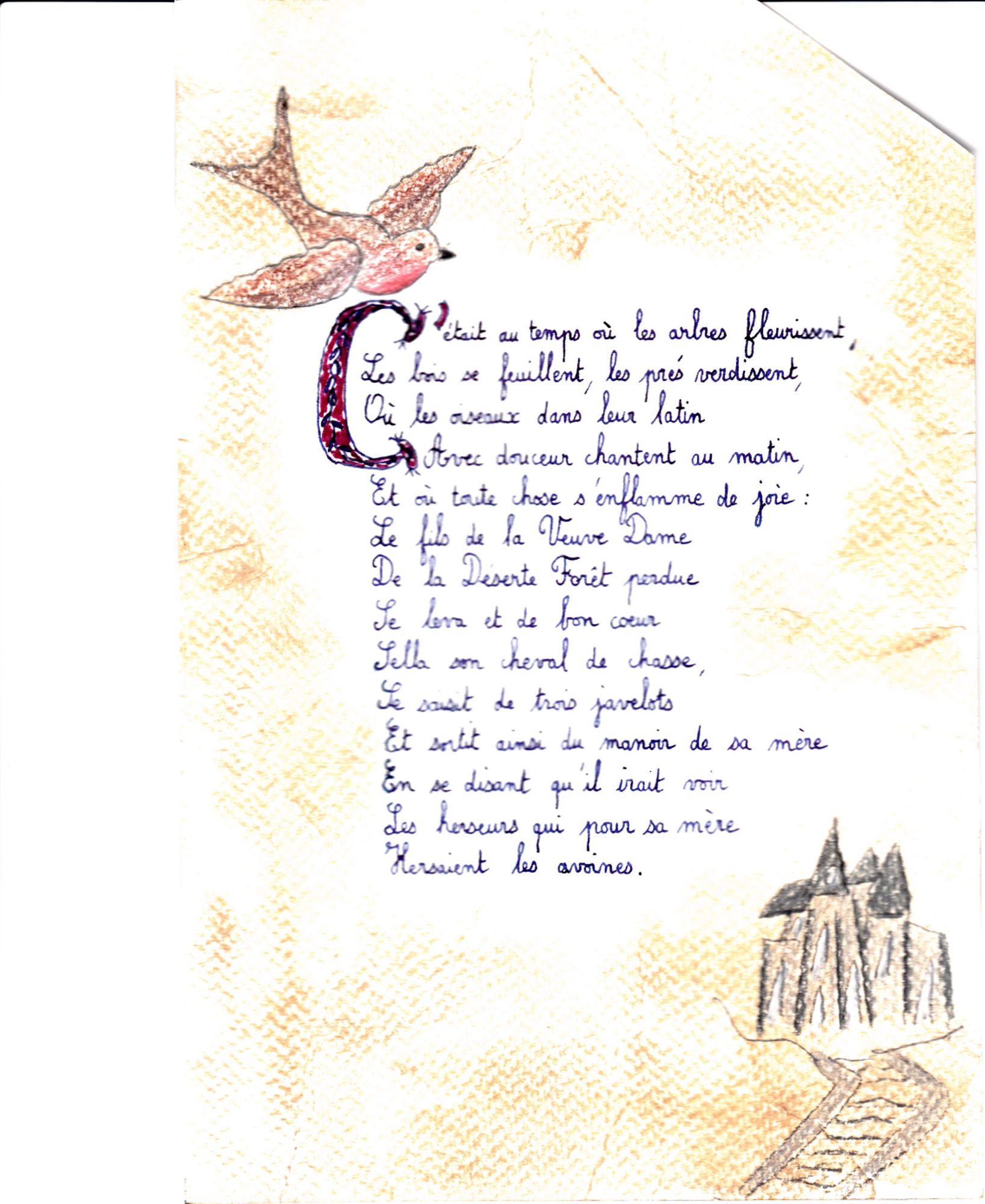 A la suite de l'atelier, les élèves recopient un poème extrait de "Perceval ou le Conte du Graal" de Chrétien de Troyes, en s'essayant à l'écriture médiévale. Voir les travaux :