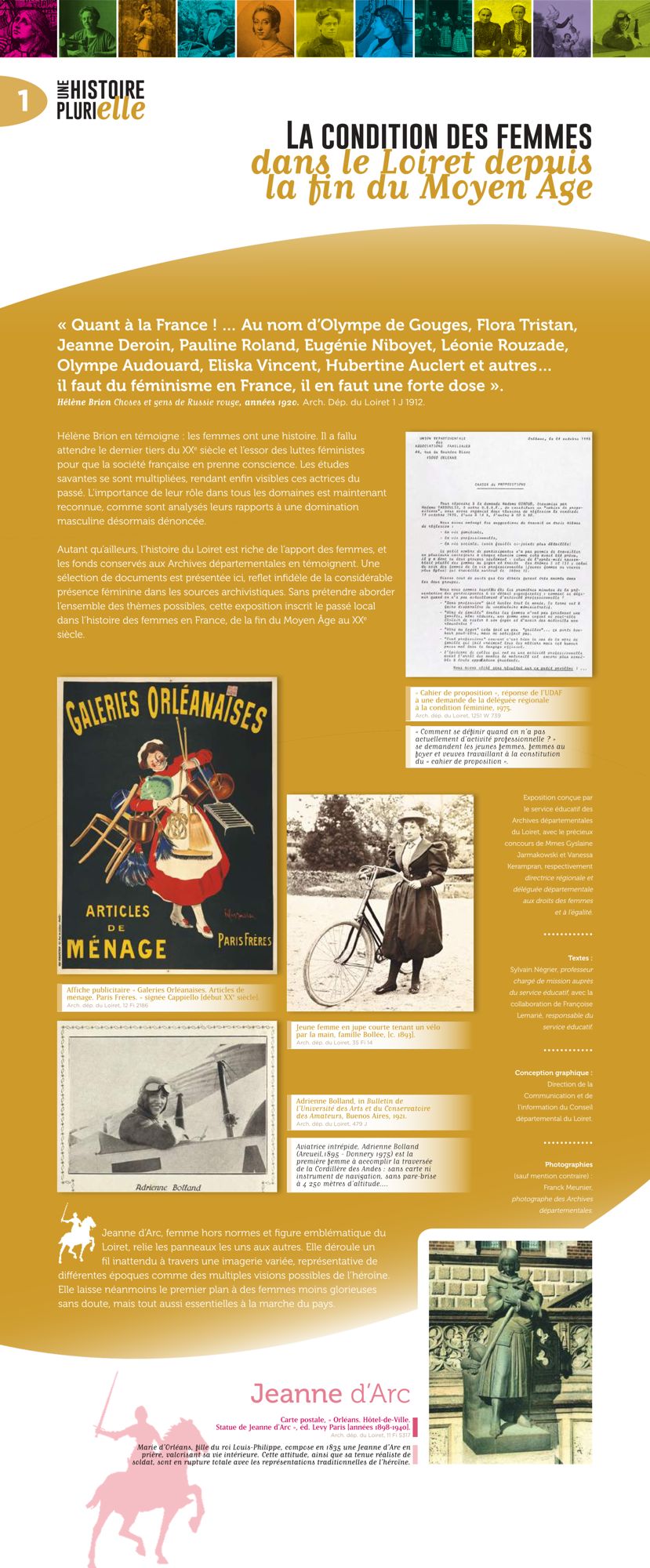 L’histoire du Loiret est riche de l’apport des femmes, qu’il s’agisse de personnalités connues ou d’actrices plus discrètes. A travers plusieurs thématiques (affirmation sociale, rapport au travail, émancipation, rôle politique…), le passé local est inscrit dans l’histoire des femmes en France, de la fin du Moyen Age à nos jours.