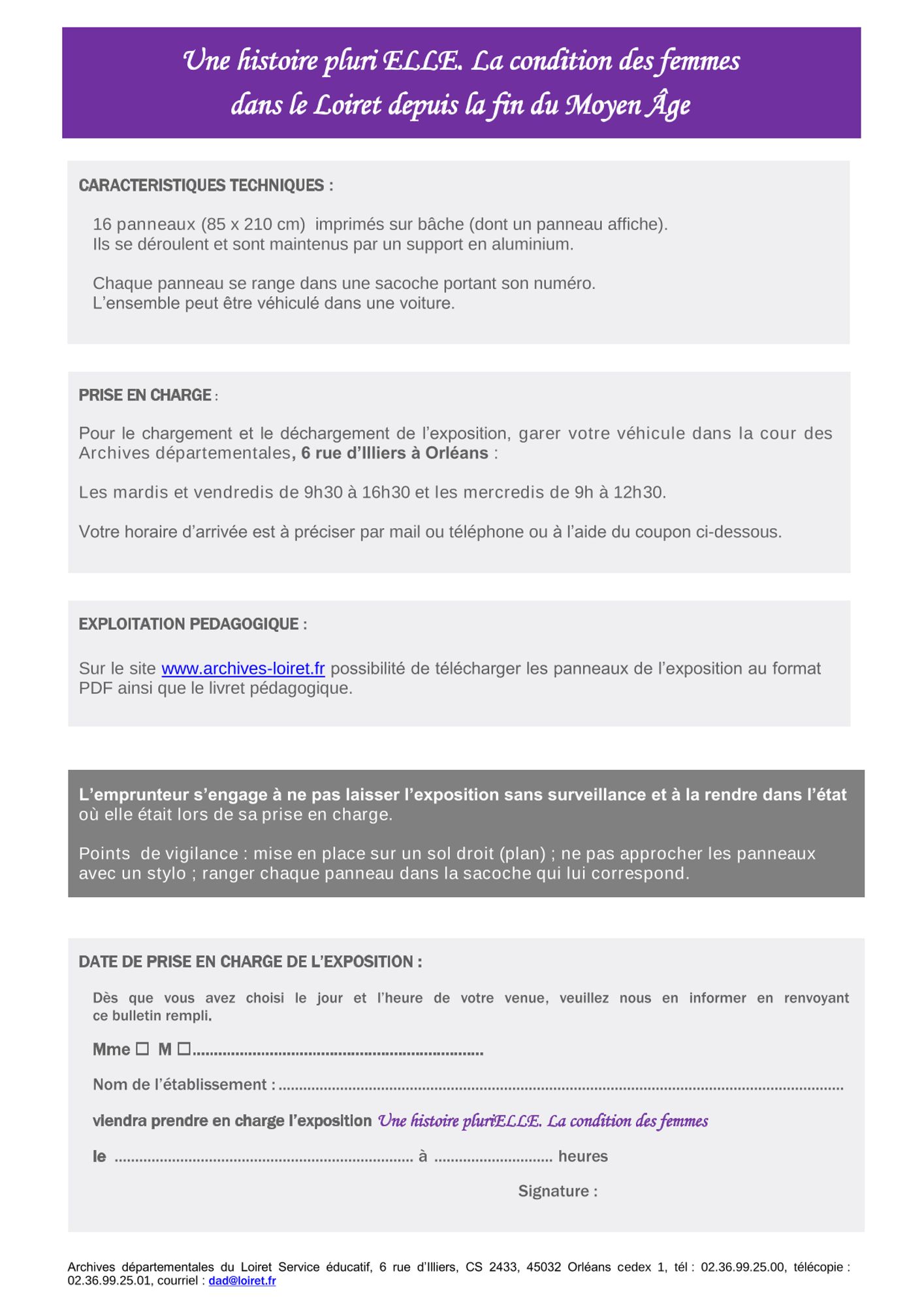 Le prêt est gratuit, la prise en charge et le retour des panneaux sont effectués par l'emprunteur.