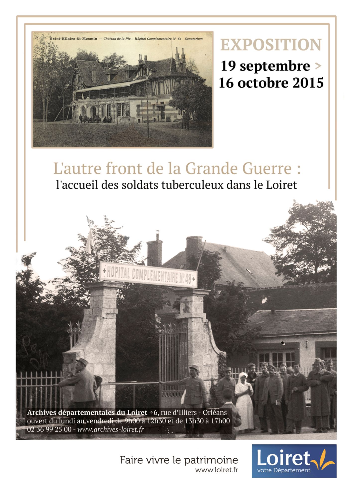 Dans le cadre des commémorations du centenaire de la Première Guerre Mondiale, le Département a souhaité jeter un éclairage particulier sur l’accueil hospitalier du militaire devenu tuberculeux dans le département du Loiret.