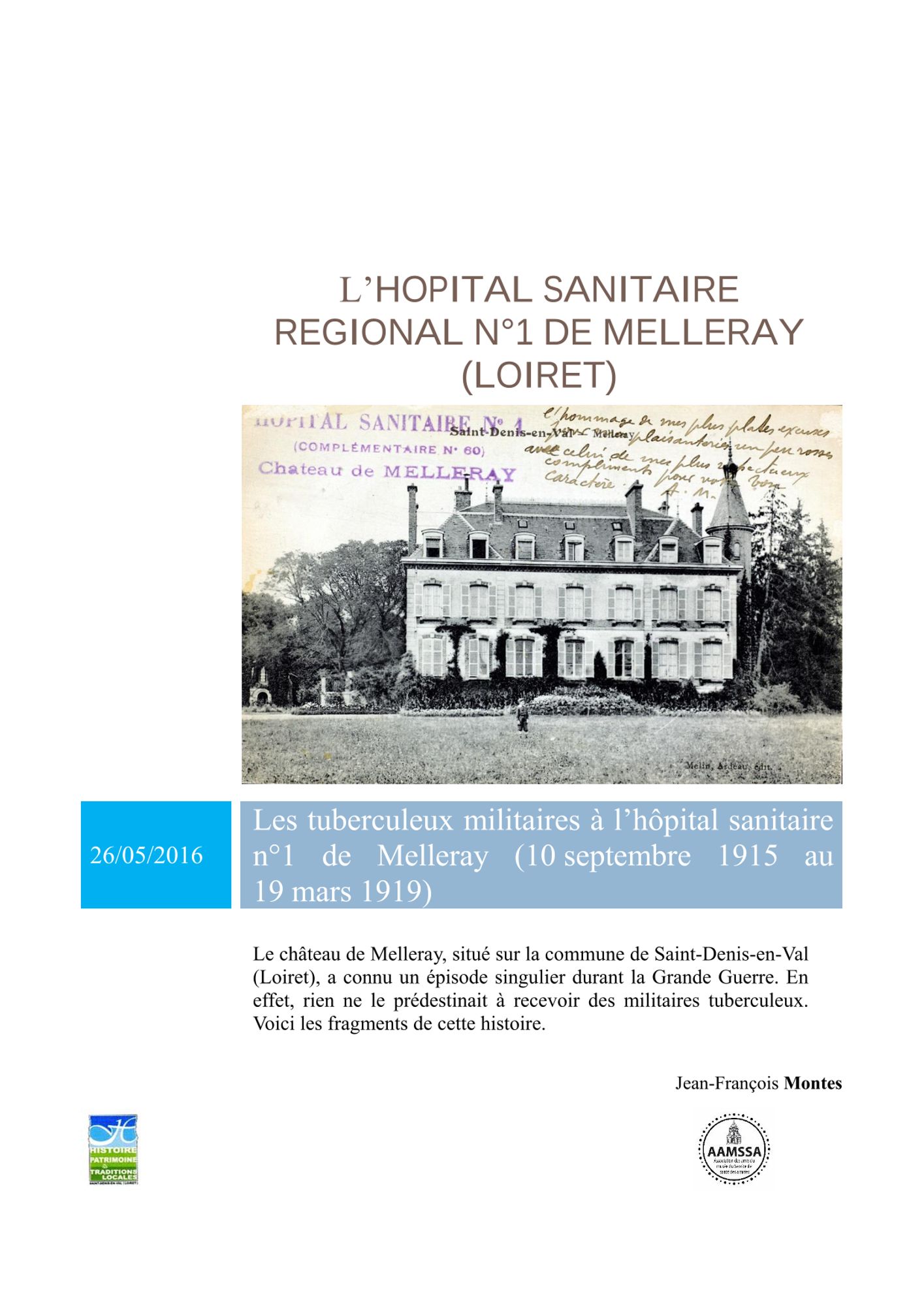 Sur le même thème, M. Montes a présenté une conférence sur l'histoire de l'hôpital de Melleray à Saint-Denis-en-Val le jeudi 26 mai 2016. Vous pouvez télécharger le texte de cette conférence ci-dessous. Il est aussi possible de consulter cette brochure en salle de lecture du Site des archives historiques et généalogiques, cote BH Br 15380.