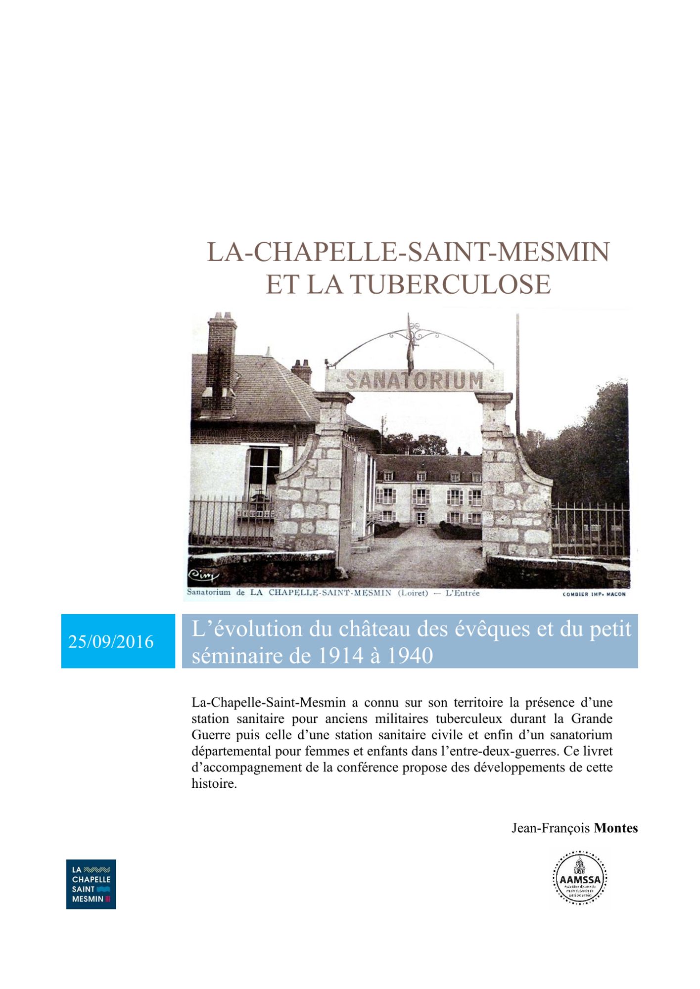 Une autre conférence s'est déroulée le 25 septembre à La Chapelle-Saint-Mesmin : "La Chapelle-Saint-Mesmin et la tuberculose : l'évolution du château des évêques et du petite séminiare de 1914 à 1940". Vous pouvez télécharger le texte de cette conférence ci-dessous Il est aussi possible de consulter cette brochure en salle de lecture du Site des archives historiques et généalogiques, cote BH Br 15519.