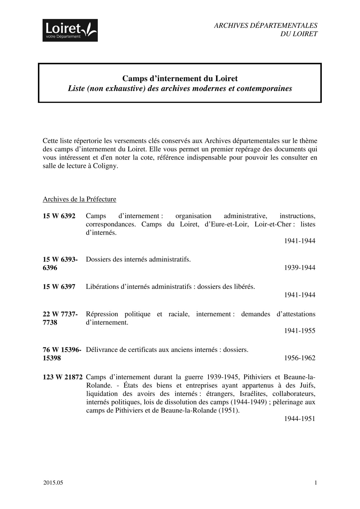 Le document à télécharger répertorie les versements les plus importants conservés aux Archives départementales du Loiret sur le thème des camps d'internement. Cette liste vous permet un premier repérage des documents qui vous intéressent et d'en noter la cote, référence indispensable pour pouvoir les consulter en salle de lecture sur le site Coligny.