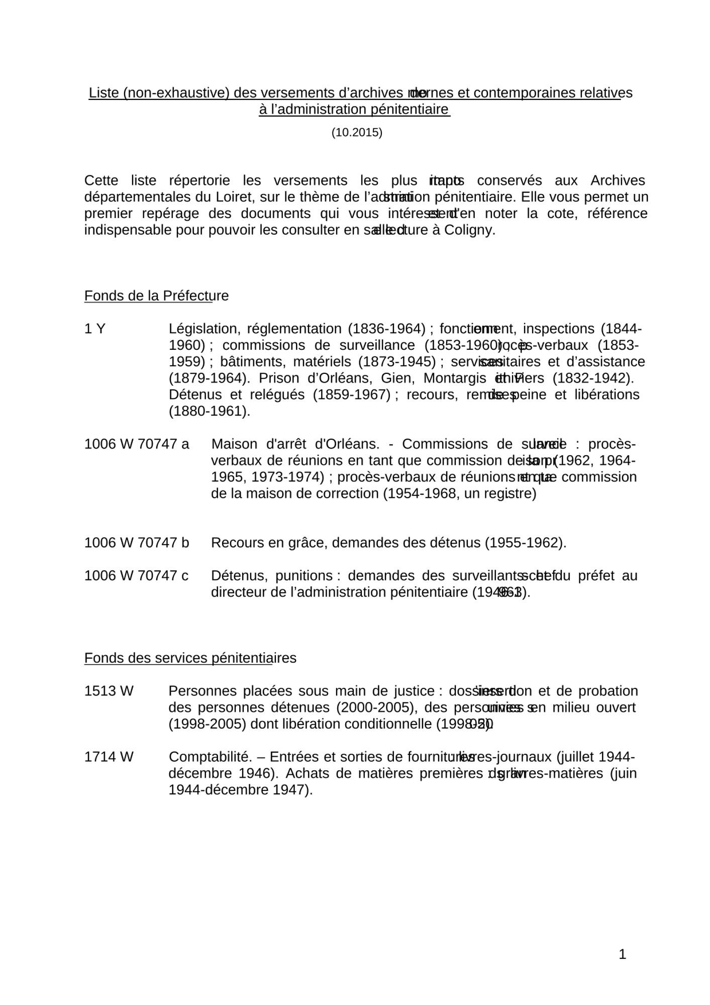 Cette liste répertorie les versements les plus importants conservés aux Archives départementales du Loiret, sur le thème de l’administration pénitentiaire. Elle vous permet un premier repérage des documents qui vous intéressent et d'en noter la cote, référence indispensable pour pouvoir les consulter en salle de lecture de Coligny.