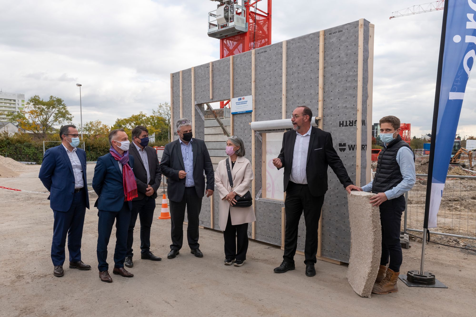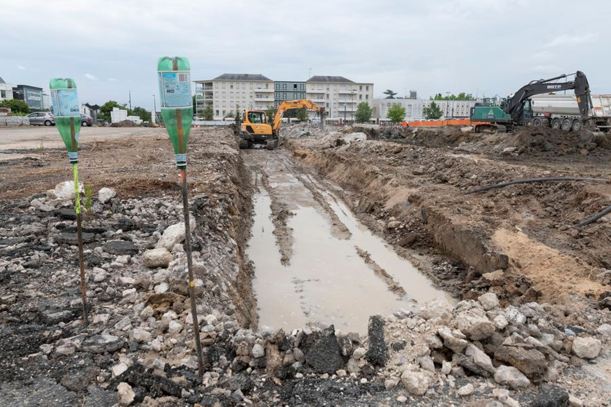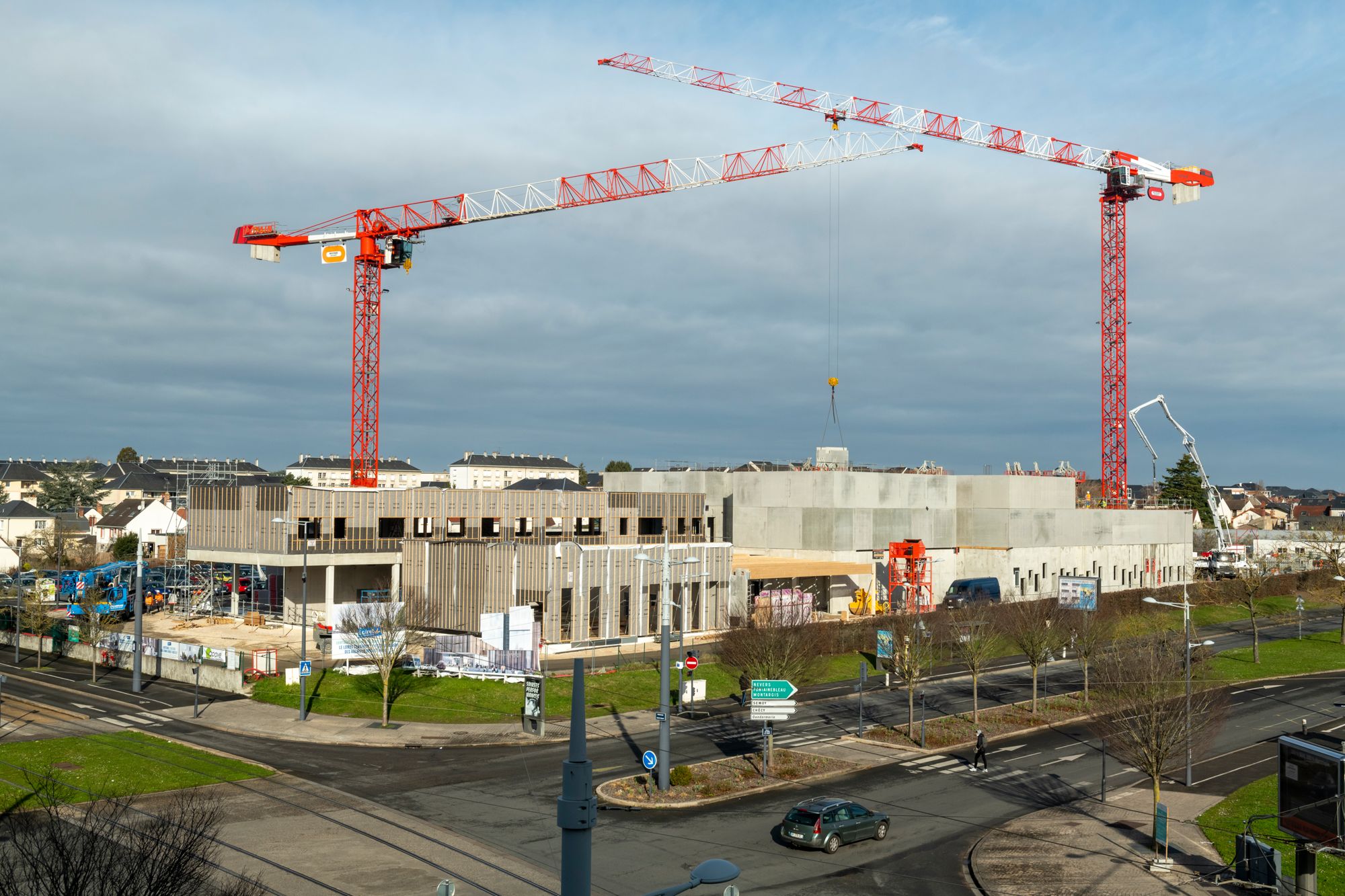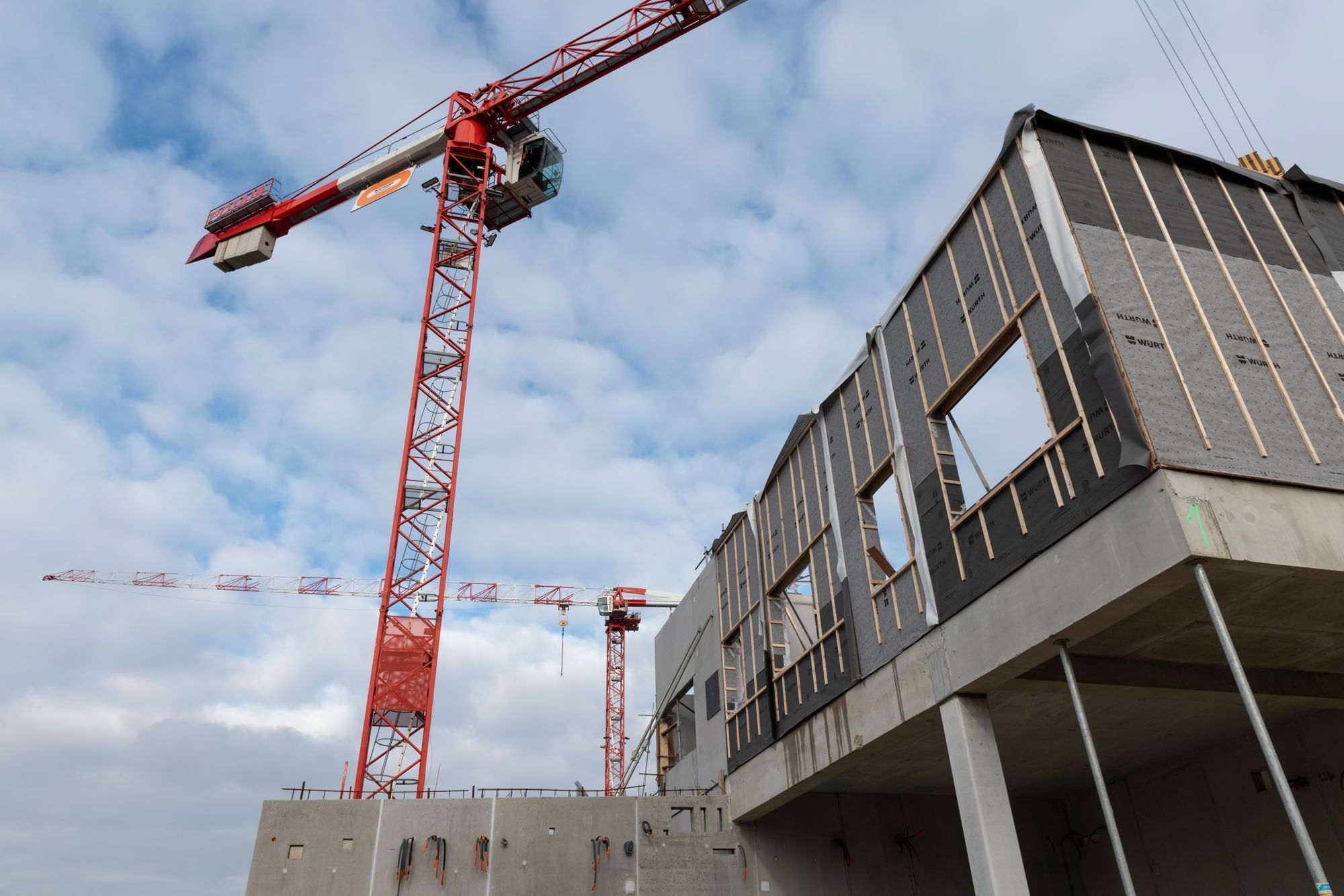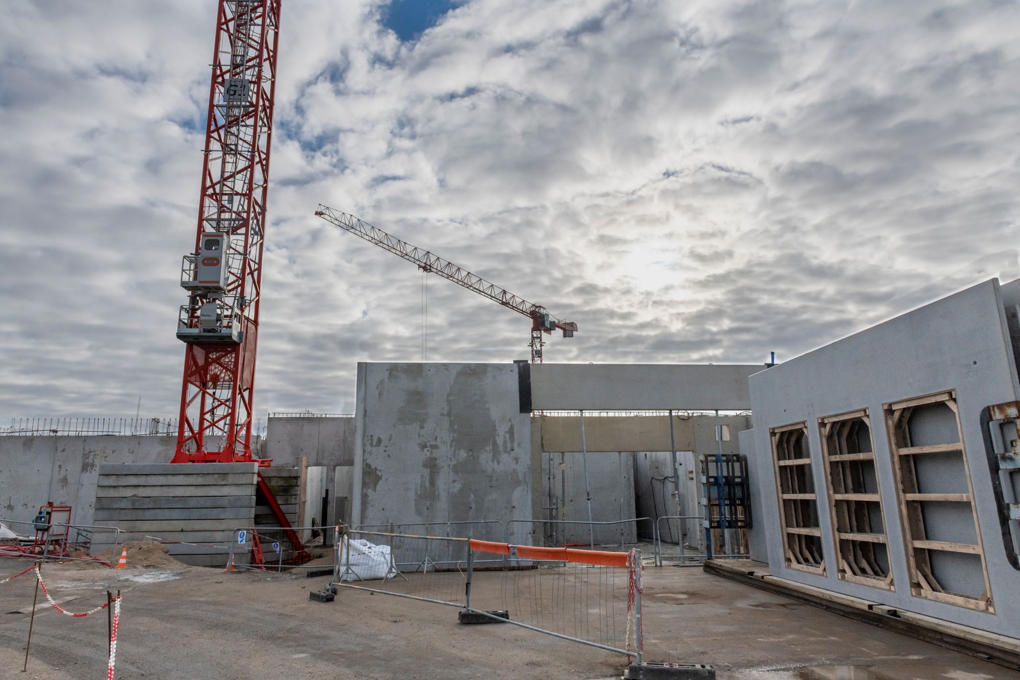 La première grue vient d'être installée. Nécessaire pour déplacer aisément les matériaux sur l'ensemble du chantier, elle signale désormais de loin le chantier dans le quartier. Les travaux sur les fondations ont également débuté : forage puis mise en place des premiers pieux de fondation.