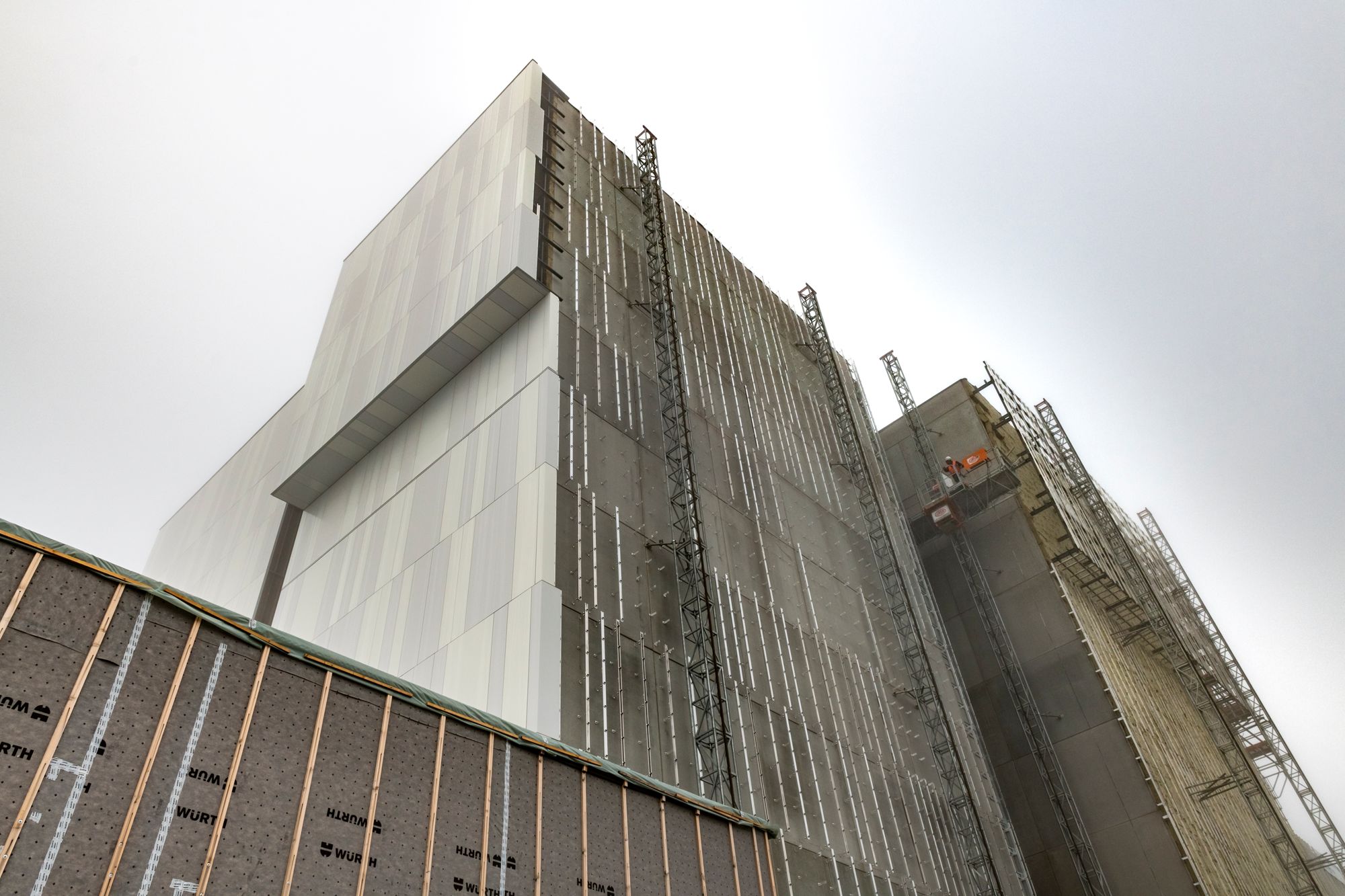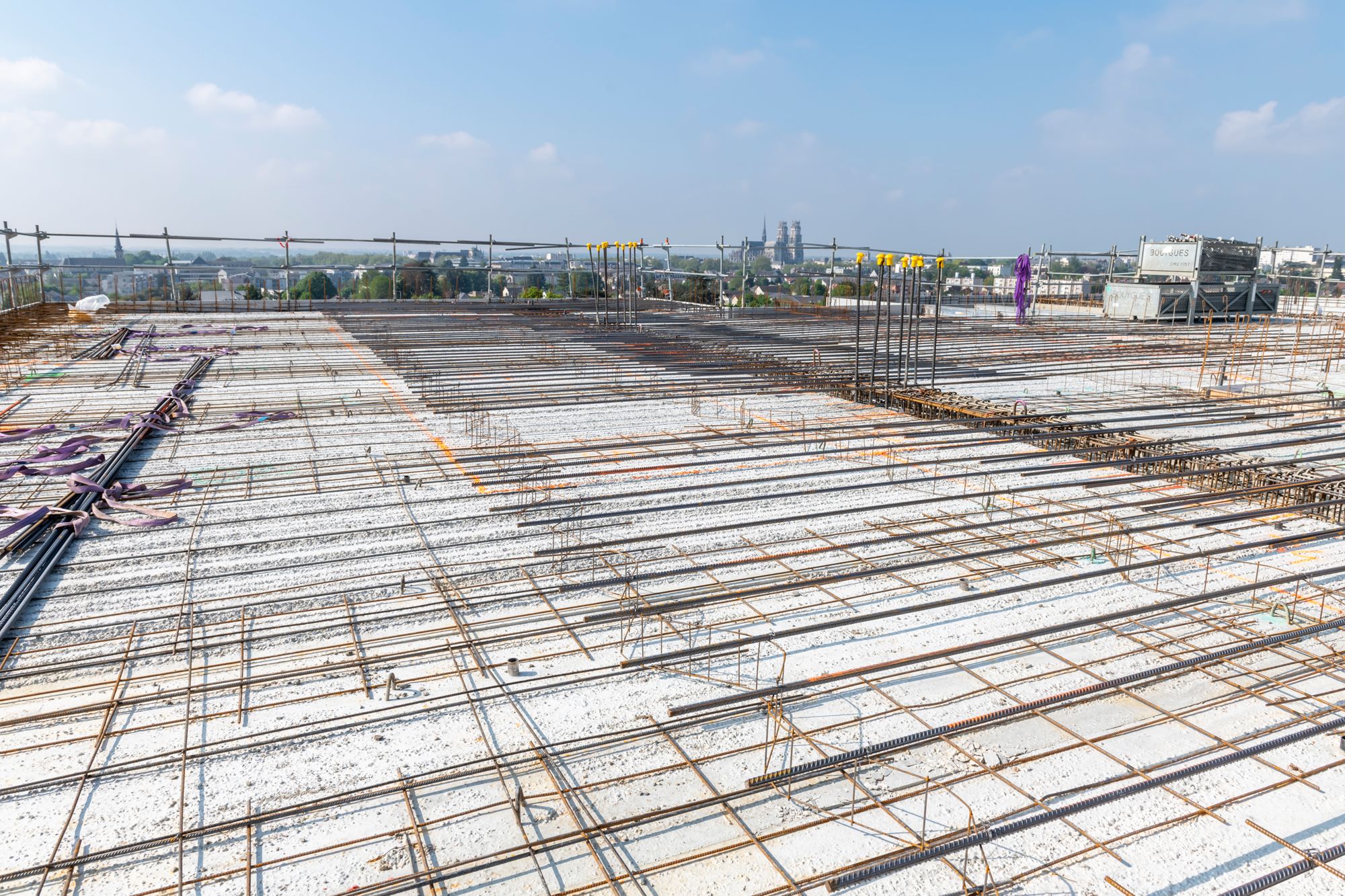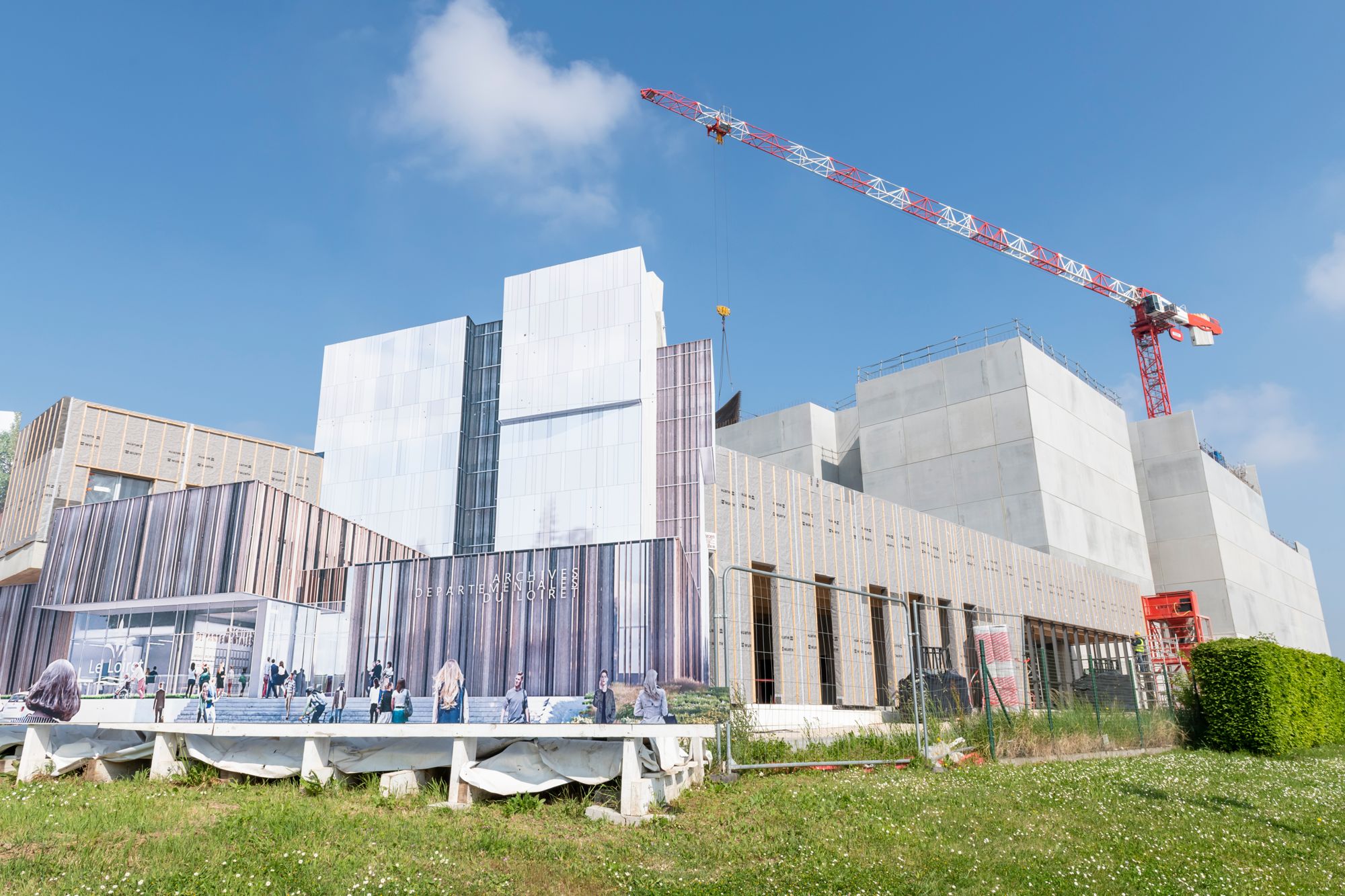 Le chantier avance vite : le 5e étage sera bientôt complètement monté, et la pose du vitrage et des réseaux d’air, d’eau et d’électricité a débuté. La zone des publics au rez-de-chaussée, notamment la salle de conférence et la salle de lecture, commence à prendre forme !