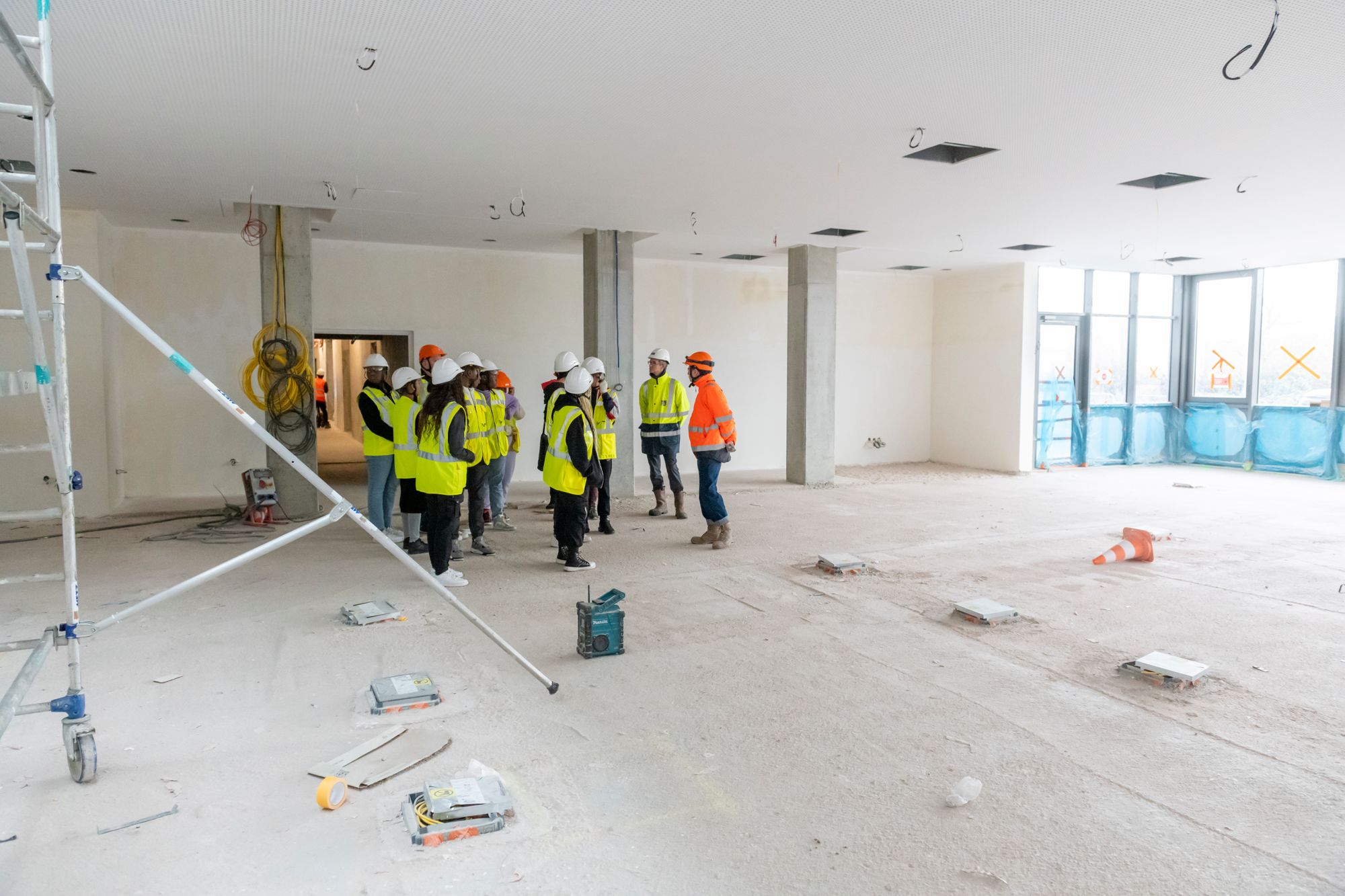 Beaucoup d’activités sur le chantier actuellement : le deuxième étage est terminé, le troisième étage débute et la plus petite des deux grues vient d’être démontée. Les visites de chantier permettent désormais d’apprécier les volumes des espaces de travail et de conservation.