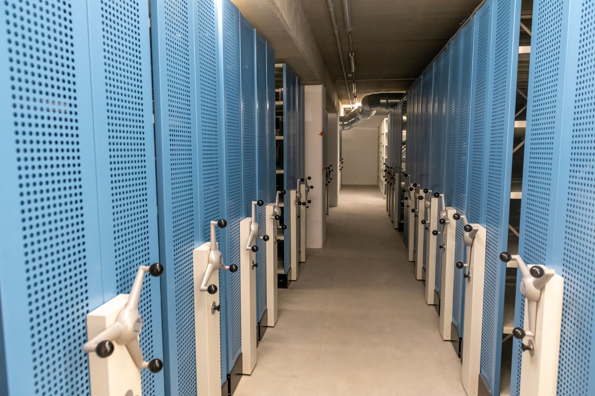Les revêtements extérieurs sont achevés et l’aménagement extérieur est en cours (mise en place de noues paysagères, d’un abri vélo et de l’accès PMR). A l’intérieur, les magasins d’archives sont équipés de leurs 60 km de rayonnages, fixes ou mobiles, les installations de mobiliers ont débuté dans les espaces publics (banque d’accueil et de salle de lecture, estrade pour la salle de conférences), et partout les travaux de finition se terminent les uns après les autres.