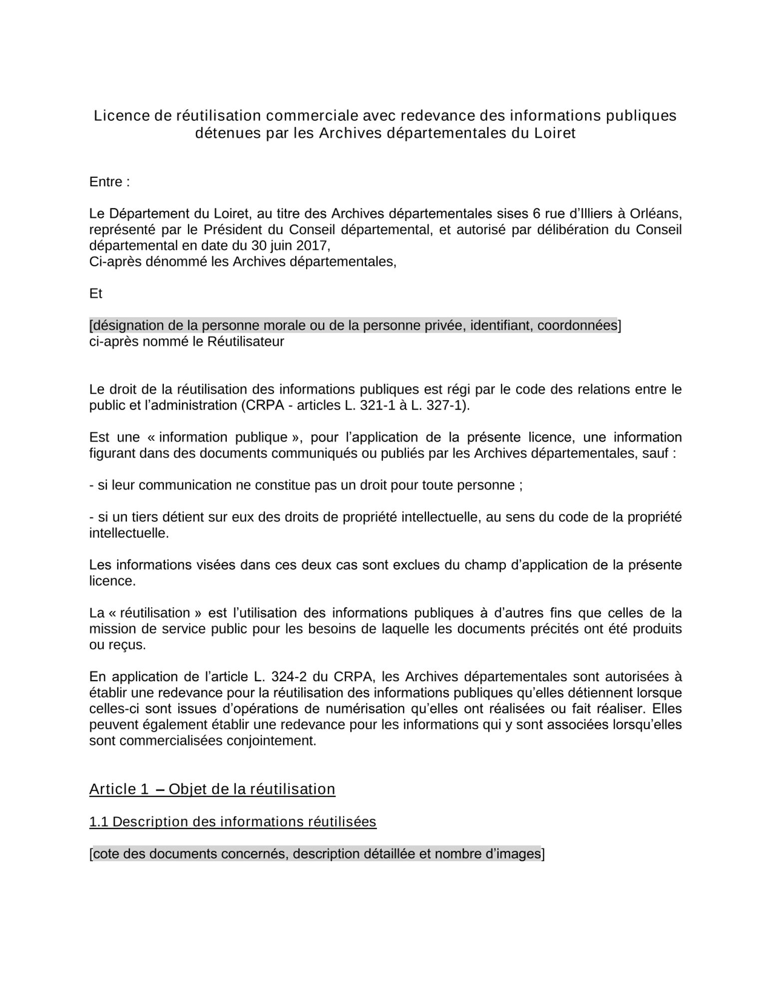 Par sa décision du 30 juin 2017, le Département du Loiret a décidé de soumettre au paiement d’une redevance certains types de réutilisation commerciale portant sur des fichiers-images issus des programmes de numérisation. Les réutilisations soumises à redevances impliquent la signature d’une licence de réutilisation. Pour tout autre usage, la réutilisation est gratuite. Ce règlement a été mis à jour le 30 septembre 2022. Le modèle de licence figure en annexe 1 et les tarifs en annexe 2.