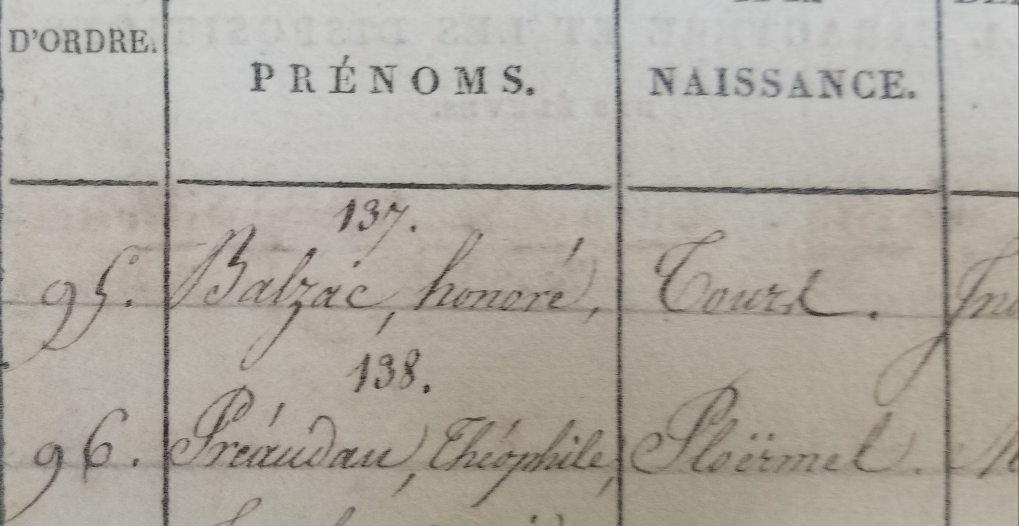 Ces trois registres révèlent que le futur écrivain est né à Tours de parents « propriétaires ». Il a intégré l’école le 22 juin 1807, alors âgé de 8 ans. La colonne « Observations » nous en dit un peu plus sur la personnalité du jeune Honoré de Balzac. En 1809, sa conduite est considérée comme « Bonne », son caractère « Lent » et ses dispositions « Très heureuses ». En 1810, de conduite toujours « Bonne », il est dorénavant décrit comme un élève « Doux » et ses dispositions sont simplement « Heureuses ». En 1811, de doux, il devient enfantin ! Rien ne laisse présager que cet écolier deviendra plus tard l’un des plus grands écrivains français.