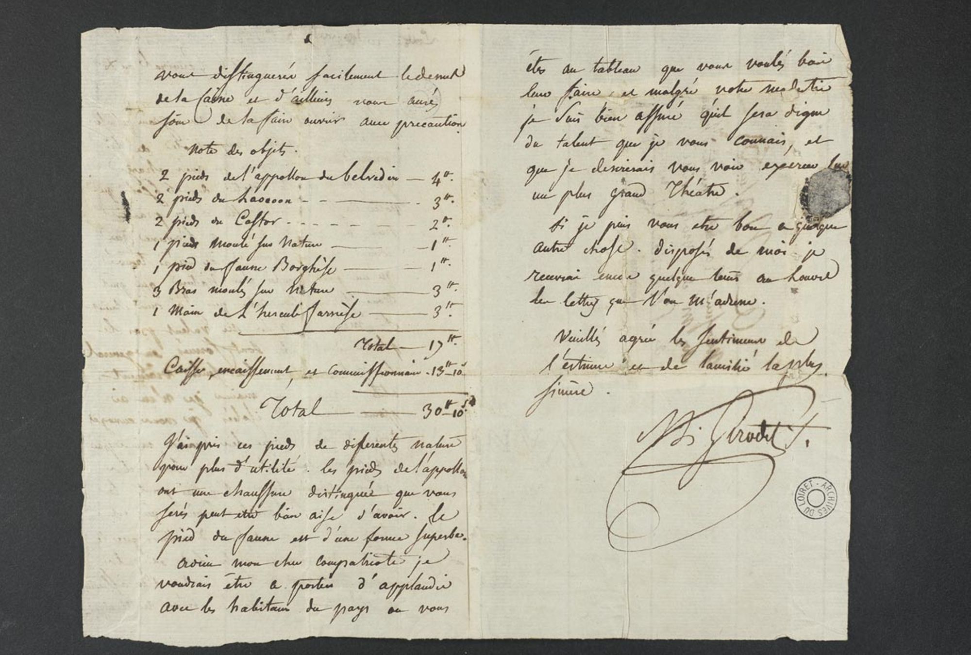 « Je me suis acquitté avec grand plaisir mon cher et aimable compatriote de la commission dont vous m’avez chargé. Je joins ici la note des objets que votre caisse contient […] je désire d’ailleurs que les objets remplissent votre but et qu’ils arrivent à bon port, l’encaissement a été soigné, ainsi je n’ai nulle inquiétude […]. J’ai pris ces pieds de différentes nature pour plus d’utilité. Les pieds de l’appollon ont une chaussure distinguée que vous seréz peut être bien aise d’avoir. Le pied du faune est d’une forme superbe. Adieu mon cher compatriote je voudrais être a portée d’applaudir avec les habitants du pays où vous êtes au tableau que vous vouléz bien leur faire et malgré votre modestie je suis bien assuré qu’il sera digne du talent que je vous connais et que je désirerais vous voir exercer sur un plus grand théâtre. Si je puis vous être à quelque autre chose disposéz de moi je recevrai encore quelque temps au Louvre les lettres que l'on m'adresse ».