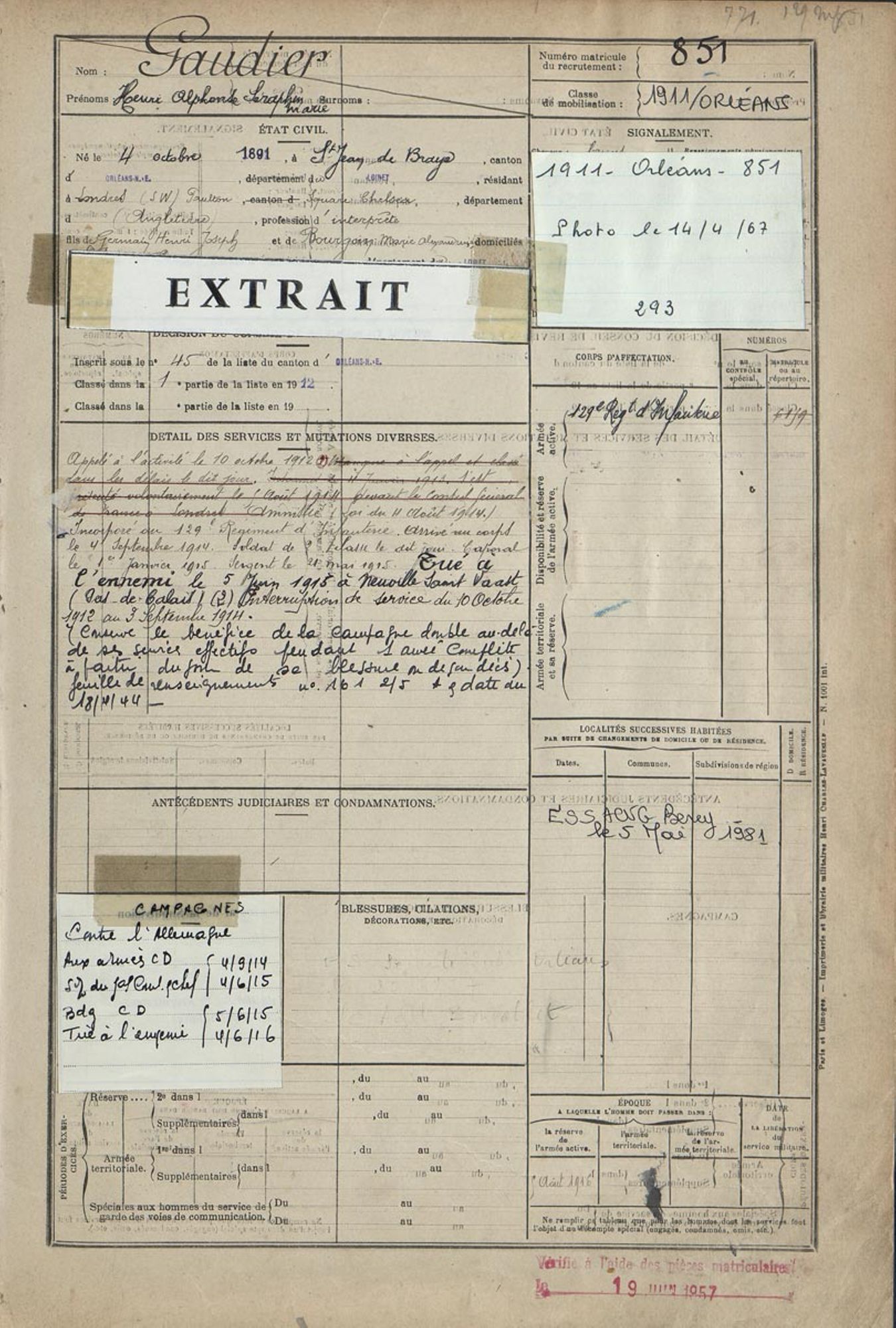 Le feuillet matricule militaire présenté, source précieuse que les Archives départementales mettent en valeur ce mois-ci, permet de retrouver le parcours militaire d’Henri Gaudier. Vivant en Angleterre, celui-ci avait d’abord été considéré comme déserteur et insoumis le 10 octobre 1912 comme en témoignent les mentions rayées a posteriori. Toutefois il est « amnistié » puisqu’il « s’est présenté volontairement le 5 août 1914 devant le Consul général de France à Londres ». Il s’engage donc dans la guerre et est incorporé au 129e régiment d’infanterie le 4 septembre 1914. Il devient caporal le 1er janvier 1915 puis sergent le 21 mai 1915.