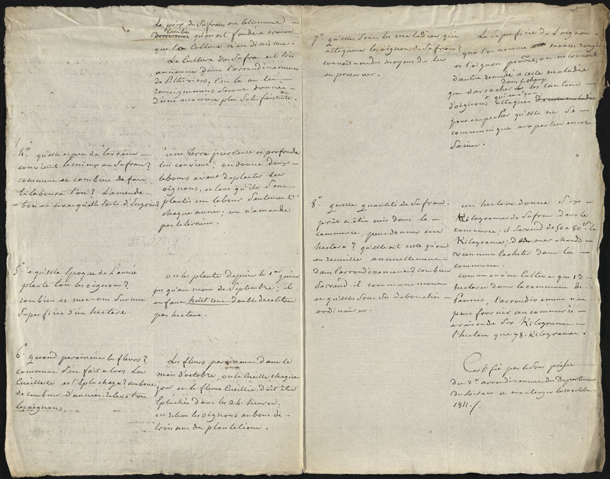 En octobre 1811, le sous-préfet de Montargis répond au questionnaire envoyé par le ministère de l’Intérieur sur la culture du safran. Les six questions concernent autant la pratique (superficie, plantations, récoltes) que les aspects commerciaux. D’après les réponses, on apprend que la commune de Pannes possède 13 hectares de terres consacrées au safran. Les premières années, les plantations ont été faites en petites quantités et, face au succès, l’exploitation s’est agrandie rapidement. Selon le sous-préfet, les oignons sont plantés entre le 1er juin et le mois de septembre et un hectare comptabiliserait 800 oignons.