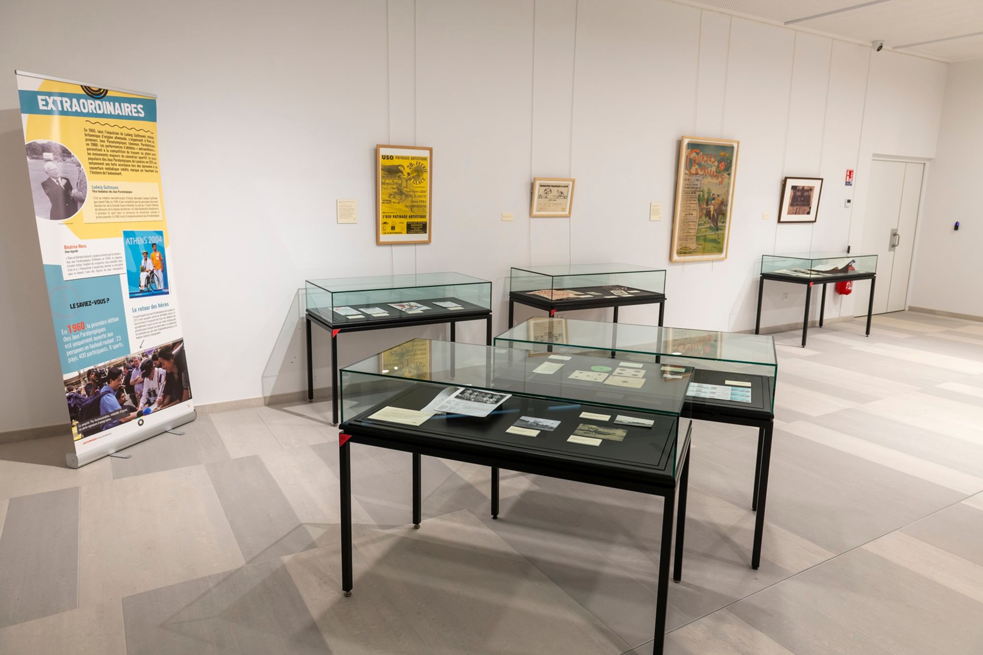 vue de l'exposition Archives dans la course ! Sport et olympisme dans le Loiret, du 21 mai au 30 août 2024, Pavillon Culture, 29 bv Marie-Stuart, Orléans.