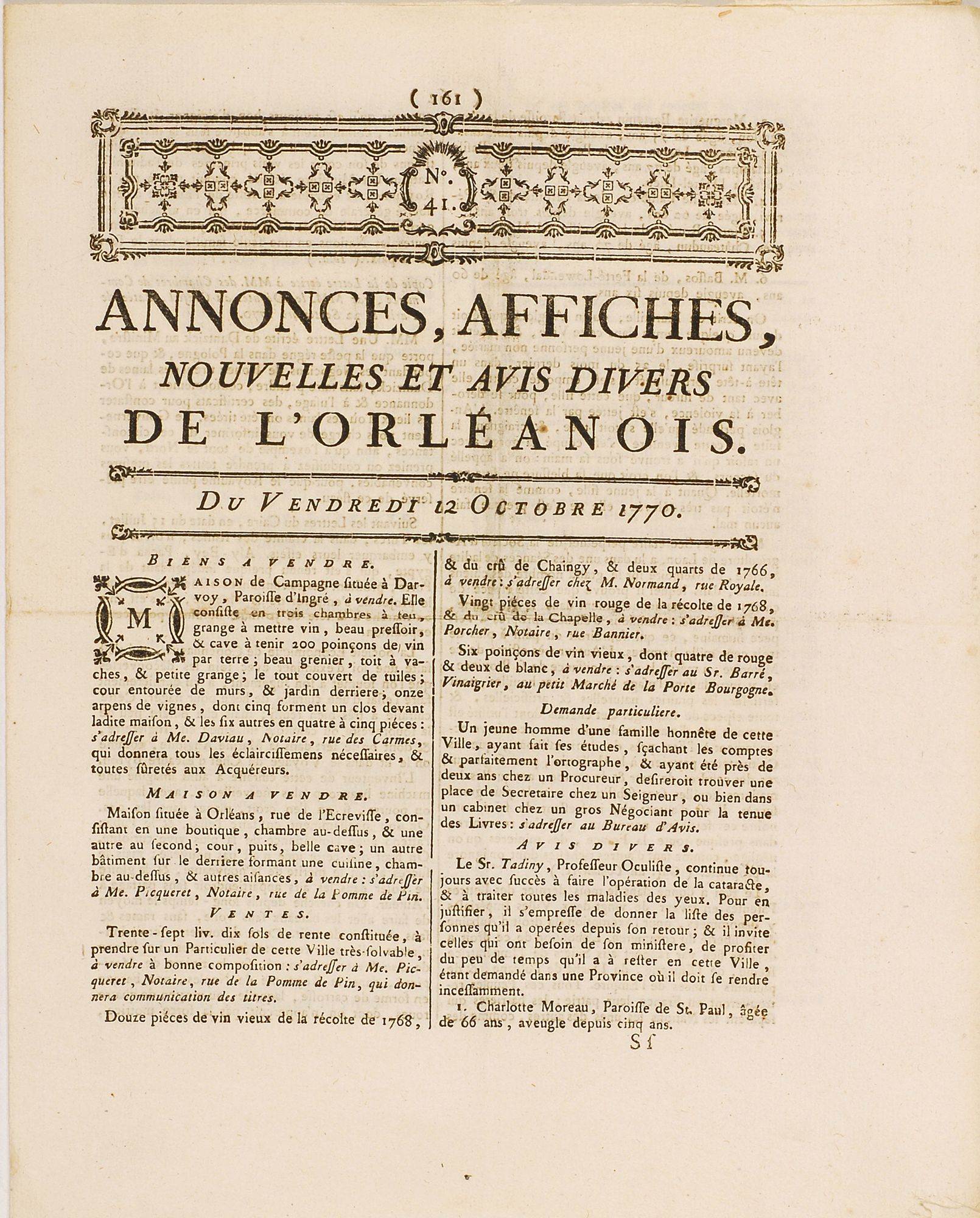 Le célèbre imprimeur orléanais Martin Couret de Villeneuve (1717-1780) lança le périodique local, les Affiches de l’Orléanais, sur le modèle de périodiques qui se multipliaient en province depuis le milieu du XVIIIe siècle. Le premier numéro de cet hebdomadaire parut le 3 février 1764 sous le titre Annonces, affiches, nouvelles et avis divers de l'Orléanois, contenant généralement tout ce qui peut intéresser cette province. Ces feuilles hebdomadaires se consacraient à des informations locales d’ordre officiel, aux nouvelles des sociétés savantes, aux spectacles, et à la publication d’annonces payantes (bien immobilier ou foncier, commerce de produits nouveaux ou denrées périssables),